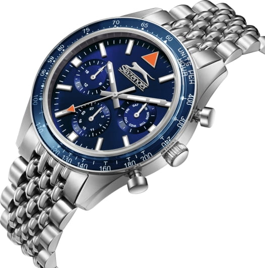 Мужские кварцевые часы Slazenger SL.09.2360.2.03 – идеальное сочетание классического дизайна и современных технологий, созданное для уверенных в себе мужчин. Корпус выполнен из суперметалла серебристого цвета, диаметром 43 мм и толщиной 12 мм, подчёркивает надежность модели и делает их идеальным аксессуаром для любой ситуации – будь то деловая встреча или повседневные выходы. Циферблат надёжно защищён минеральным стекломМинеральное стеклоМинеральное стекло представляет собой искусственно выращенный минерал кварца. Такое стекло отличается особой устойчивостью к повреждениям и царапинам. Уступает по некоторым качествам сапфировому стеклу., которое устойчиво к механическим повреждениям и сохраняет кристальную прозрачность. Неподвижный безельБезельВнешний ободок, закрепляющий стекло. В спортивных часах так называется поворотное кольцо с делениями на циферблате, выполняет роль таймера – замеряет отрезки времени на шкале. Неподвижный безель – элемент декора. Однонаправленно вращающийся безель на дайверских часах позволяет фиксировать моменты погружения и выныривания на поверхность. с IP-покрытиемIP-покрытиеМетод ионного напыления. Демонстрирует повышенную устойчивость к истиранию, окислению и химическим веществам. Под воздействием высокого давления и температуры около 1500°C молекулы металла надёжно соединяются с частицами корпуса часов. синего цвета. Стальной браслет на раскладной застёжкеРаскладная застёжкаТакой тип застёжки используется только на браслетах из металла. Она никогда не раскрывается полностью, происходит разделение на 2 и более частей. Раскладывающая застёжка снизит вероятность потери часов к минимуму. удобно облегает запястье, обеспечивая надёжность и комфорт в повседневном ношении. Стрелки и метки покрыты люминесцентным покрытиемЛюминесцентное покрытиеПозволяет считывать показания времени в темноте. Производители наносят на стрелки, часовые индексы, безель или поверхность циферблата светонакопительный состав, дающий холодное свечение., обеспечивающим отличную читаемость в темноте. Эти часы станут не просто аксессуаром, а надежным спутником в любой ситуации, подчеркивая ваш безупречный вкус и деловой стиль. Вынесенный циферблат с 24-х часовым указателем времени и функция тахиметраТахиметрРазмеченная шкала, располагается на ободке или безеле часов. Тахиметр позволяет рассчитать скорость на определённом участке пути, расстояние измеряется в километрах или милях.. Водозащита 50 метров позволит защитить корпус от случайных брызг или капель дождя.