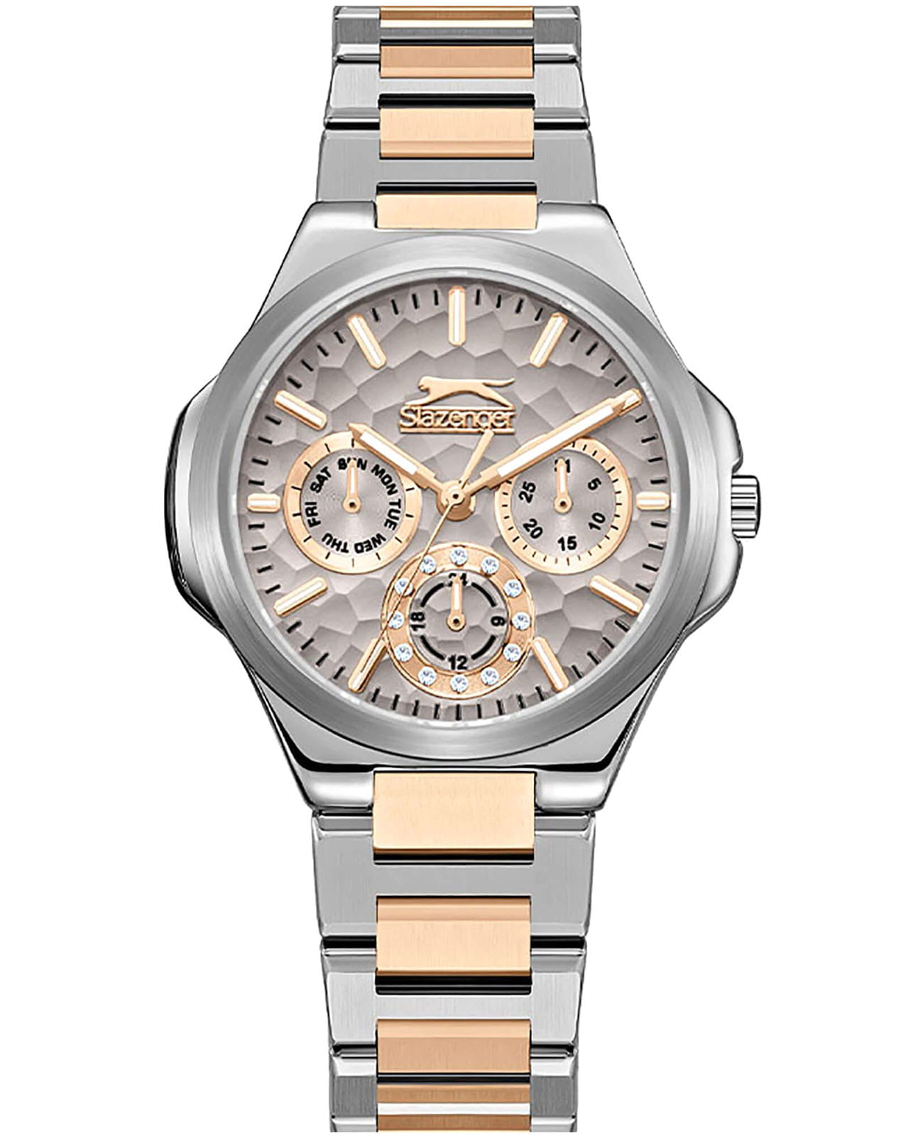 Женские кварцевые часы Slazenger SL.09.2365.4.02 – это сочетание элегантности, современного стиля и надёжности. Изящный корпус из суперметалла серебристого цвета, диаметром 33 мм и толщиной 10 мм, подчёркивает утончённость модели и делает их идеальным аксессуаром для любой ситуации – будь то деловая встреча, романтический вечер или повседневные выходы. Циферблат надёжно защищён минеральным стекломМинеральное стеклоМинеральное стекло представляет собой искусственно выращенный минерал кварца. Такое стекло отличается особой устойчивостью к повреждениям и царапинам. Уступает по некоторым качествам сапфировому стеклу., которое устойчиво к механическим повреждениям и сохраняет кристальную прозрачность. Браслет из суперметалла с частичным IP-покрытиемIP-покрытиеМетод ионного напыления. Демонстрирует повышенную устойчивость к истиранию, окислению и химическим веществам. Под воздействием высокого давления и температуры около 1500°C молекулы металла надёжно соединяются с частицами корпуса часов. цвета розового золота удобно облегает запястье и фиксируется с помощью раскладной застёжкиРаскладная застёжкаТакой тип застёжки используется только на браслетах из металла. Она никогда не раскрывается полностью, происходит разделение на 2 и более частей. Раскладывающая застёжка снизит вероятность потери часов к минимуму., обеспечивая надёжность и комфорт в повседневном ношении. Утончённый стиль, внимание к деталям и практичность делают эту модель идеальным выбором для современных женщин, ценящих эстетику и функциональность. Стрелки и метки покрыты люминесцентным покрытиемЛюминесцентное покрытиеПозволяет считывать показания времени в темноте. Производители наносят на стрелки, часовые индексы, безель или поверхность циферблата светонакопительный состав, дающий холодное свечение., обеспечивающим отличную читаемость в темноте. Вынесенный циферблат с 24-х часовым указателем времени украшен фианитами. Водозащита до 30 метров позволит защитить корпус от случайных брызг или капель дождя.