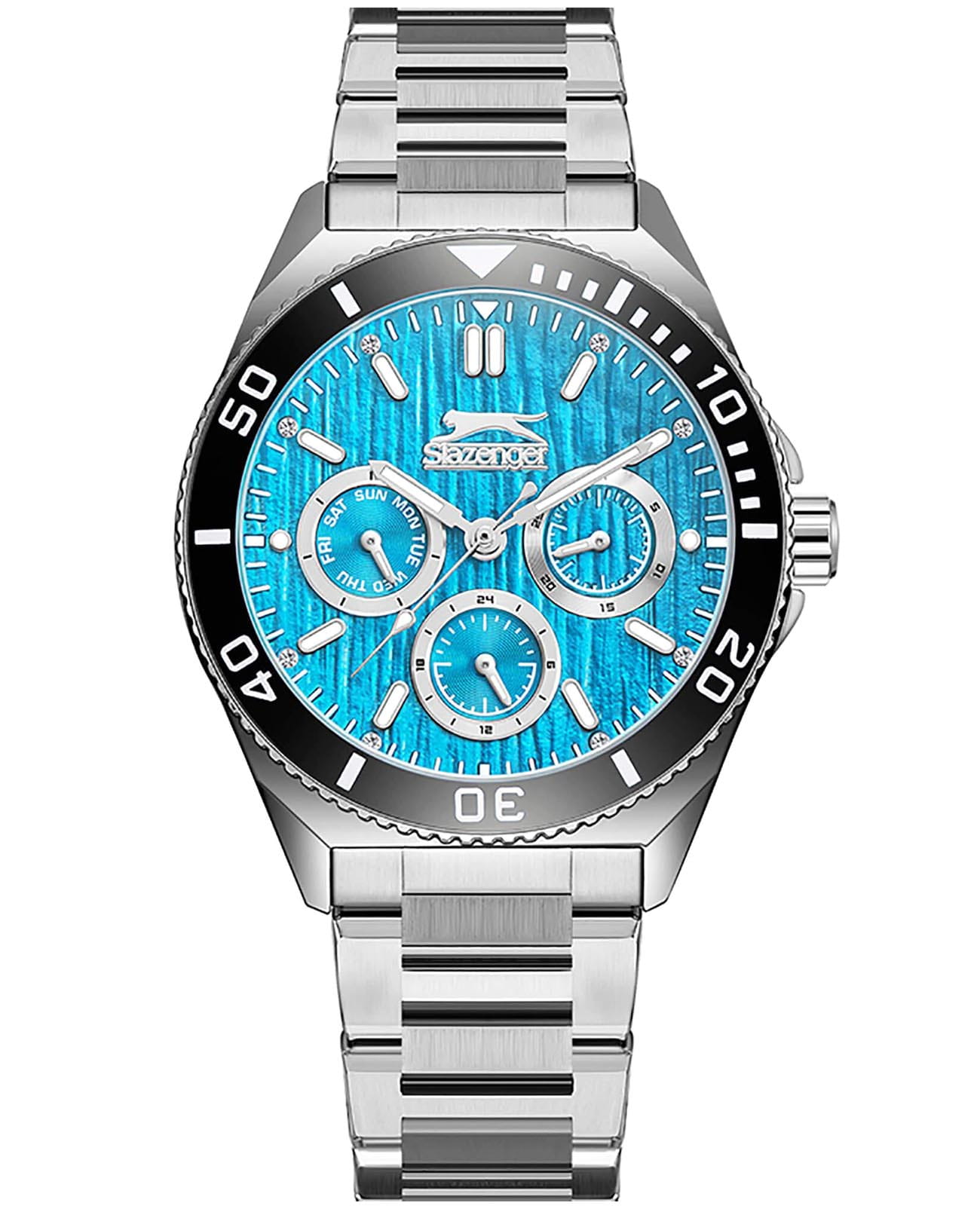 Женские кварцевые часы Slazenger SL.09.2371.2.03 – это сочетание элегантности, современного стиля и надёжности. Изящный корпус из суперметалла серебристого цвета, диаметром 38.5 мм и толщиной 11 мм, подчёркивает утончённость модели и делает их идеальным аксессуаром для любой ситуации – будь то деловая встреча, романтический вечер или повседневные выходы. Циферблат надёжно защищён минеральным стекломМинеральное стеклоМинеральное стекло представляет собой искусственно выращенный минерал кварца. Такое стекло отличается особой устойчивостью к повреждениям и царапинам. Уступает по некоторым качествам сапфировому стеклу., которое устойчиво к механическим повреждениям и сохраняет кристальную прозрачность. БезельБезельВнешний ободок, закрепляющий стекло. В спортивных часах так называется поворотное кольцо с делениями на циферблате, выполняет роль таймера – замеряет отрезки времени на шкале. Неподвижный безель – элемент декора. Однонаправленно вращающийся безель на дайверских часах позволяет фиксировать моменты погружения и выныривания на поверхность. с IP-покрытиемIP-покрытиеМетод ионного напыления. Демонстрирует повышенную устойчивость к истиранию, окислению и химическим веществам. Под воздействием высокого давления и температуры около 1500°C молекулы металла надёжно соединяются с частицами корпуса часов. черного цвета. Браслет из суперметалла удобно облегает запястье и фиксируется с помощью раскладной застёжкиРаскладная застёжкаТакой тип застёжки используется только на браслетах из металла. Она никогда не раскрывается полностью, происходит разделение на 2 и более частей. Раскладывающая застёжка снизит вероятность потери часов к минимуму., обеспечивая надёжность и комфорт в повседневном ношении. Утончённый стиль, внимание к деталям и практичность делают эту модель идеальным выбором для современных женщин, ценящих эстетику и функциональность. Стрелки и метки покрыты люминесцентным покрытиемЛюминесцентное покрытиеПозволяет считывать показания времени в темноте. Производители наносят на стрелки, часовые индексы, безель или поверхность циферблата светонакопительный состав, дающий холодное свечение., обеспечивающим отличную читаемость в темноте. Вынесенный циферблат с 24-х часовым указателем времени украшен фианитами. Водозащита до 30 метров позволит защитить корпус от случайных брызг или капель дождя.