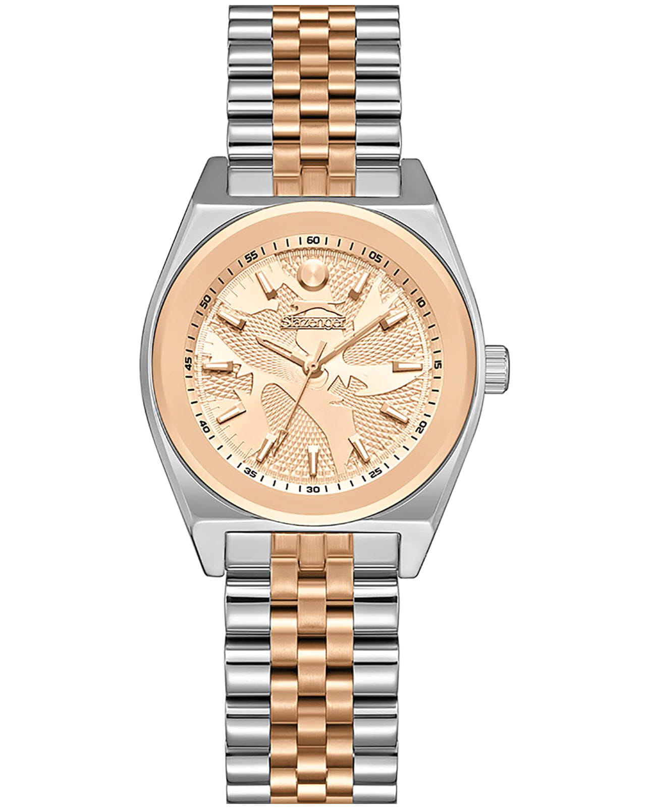 Женские кварцевые часы Slazenger SL.09.2376.3.03 – это сочетание элегантности, современного стиля и надёжности. Изящный корпус из суперметалла серебристого цвета, диаметром 32 мм и толщиной 9 мм, подчёркивает утончённость модели и делает их идеальным аксессуаром для любой ситуации – будь то деловая встреча, романтический вечер или повседневные выходы. Циферблат надёжно защищён минеральным стекломМинеральное стеклоМинеральное стекло представляет собой искусственно выращенный минерал кварца. Такое стекло отличается особой устойчивостью к повреждениям и царапинам. Уступает по некоторым качествам сапфировому стеклу., которое устойчиво к механическим повреждениям и сохраняет кристальную прозрачность. Неподвижный безельБезельВнешний ободок, закрепляющий стекло. В спортивных часах так называется поворотное кольцо с делениями на циферблате, выполняет роль таймера – замеряет отрезки времени на шкале. Неподвижный безель – элемент декора. Однонаправленно вращающийся безель на дайверских часах позволяет фиксировать моменты погружения и выныривания на поверхность. с IP-покрытиемIP-покрытиеМетод ионного напыления. Демонстрирует повышенную устойчивость к истиранию, окислению и химическим веществам. Под воздействием высокого давления и температуры около 1500°C молекулы металла надёжно соединяются с частицами корпуса часов. цвета розового золота. Браслет из суперметалла с частичным IP-покрытиемIP-покрытиеМетод ионного напыления. Демонстрирует повышенную устойчивость к истиранию, окислению и химическим веществам. Под воздействием высокого давления и температуры около 1500°C молекулы металла надёжно соединяются с частицами корпуса часов. удобно облегает запястье и фиксируется с помощью раскладной застёжкиРаскладная застёжкаТакой тип застёжки используется только на браслетах из металла. Она никогда не раскрывается полностью, происходит разделение на 2 и более частей. Раскладывающая застёжка снизит вероятность потери часов к минимуму., обеспечивая надёжность и комфорт в повседневном ношении. Утончённый стиль, внимание к деталям и практичность делают эту модель идеальным выбором для современных женщин, ценящих эстетику и функциональность. Метки покрыты люминесцентным покрытиемЛюминесцентное покрытиеПозволяет считывать показания времени в темноте. Производители наносят на стрелки, часовые индексы, безель или поверхность циферблата светонакопительный состав, дающий холодное свечение., обеспечивающим отличную читаемость в темноте. Водозащита до 30 метров позволит защитить корпус от случайных брызг или капель дождя.