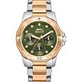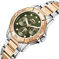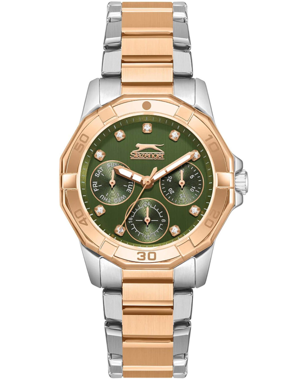 Женские кварцевые часы Slazenger — это элегантный и функциональный аксессуар. Корпус диаметром 33,5 мм и толщиной 10,5 мм выполнен из суперметалла. Безель с IP-покрытиемIP-покрытиеМетод ионного напыления. Демонстрирует повышенную устойчивость к истиранию, окислению и химическим веществам. Под воздействием высокого давления и температуры около 1500°C молекулы металла надёжно соединяются с частицами корпуса часов.. Циферблат зелёного цвета оформлен индексами и стрелками, украшен фианитами. Циферблат защищён минеральным стекломМинеральное стеклоМинеральное стекло представляет собой искусственно выращенный минерал кварца. Такое стекло отличается особой устойчивостью к повреждениям и царапинам. Уступает по некоторым качествам сапфировому стеклу.. Механизм — кварцевый. Часы оснащены индикацией дня недели, даты и 12/24-часового формата времени. Часы оснащены браслетом из суперметалла с IP-покрытиемIP-покрытиеМетод ионного напыления. Демонстрирует повышенную устойчивость к истиранию, окислению и химическим веществам. Под воздействием высокого давления и температуры около 1500°C молекулы металла надёжно соединяются с частицами корпуса часов. и раскладной застёжкойРаскладная застёжкаТакой тип застёжки используется только на браслетах из металла. Она никогда не раскрывается полностью, происходит разделение на 2 и более частей. Раскладывающая застёжка снизит вероятность потери часов к минимуму.. Водонепроницаемость 50 м позволяет использовать часы в повседневных условиях. Гарантия — 12 месяцев. Идеальный выбор для тех, кто ценит стиль, функциональность и качество.