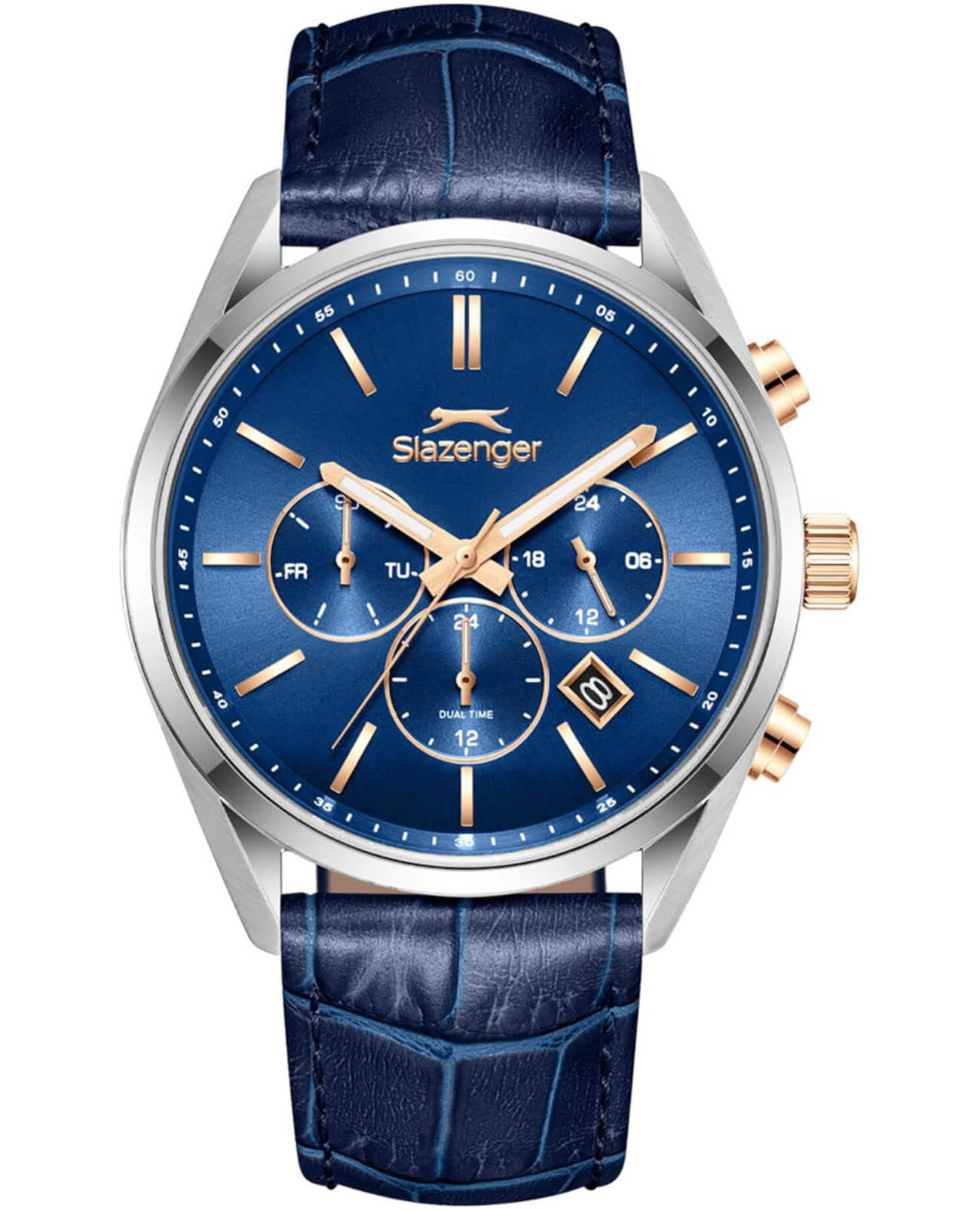 Мужские кварцевые часы Slazenger — это выразительный и функциональный аксессуар. Корпус диаметром 42 мм и толщиной 12 мм выполнен из нержавеющей стали 316L. Циферблат синего цвета оформлен индексами и стрелками. Циферблат защищён минеральным стекломМинеральное стеклоМинеральное стекло представляет собой искусственно выращенный минерал кварца. Такое стекло отличается особой устойчивостью к повреждениям и царапинам. Уступает по некоторым качествам сапфировому стеклу.. Механизм — кварцевый. Часы оснащены индикацией дня недели, даты, 12/24-часового формата времени и функцией второго часового пояса (GMT)Второй часовой поясФункция, позволяющая отображать время двух часовых поясов одновременно.. Окошко даты расположено между 4 и 5 часами. Стрелки и метки с люминесцентным покрытиемЛюминесцентное покрытиеПозволяет считывать показания времени в темноте. Производители наносят на стрелки, часовые индексы, безель или поверхность циферблата светонакопительный состав, дающий холодное свечение., обеспечивающим хорошую читаемость в темноте. Часы оснащены кожаным ремешком с стандартной застёжкой. Водонепроницаемость 100 м позволяет использовать часы для плавания и повседневного ношения. Гарантия — 12 месяцев. Идеальный выбор для тех, кто ценит стиль, функциональность и качество.