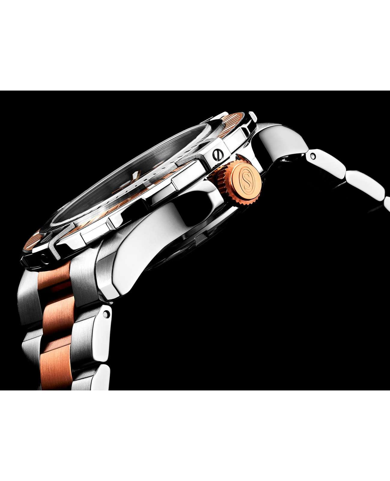 Мужские наручные часы Stuhrling Original 1005.04 из коллекции Aquadiver сочетают в себе надежность и стильный дизайн, идеально подходящий для активного образа жизни. Модель обладает круглым корпусом диаметром 45 мм, изготовленным из нержавеющей стали, что обеспечивает повышенную устойчивость к внешним воздействиям. БезельБезельВнешний ободок, закрепляющий стекло. В спортивных часах так называется поворотное кольцо с делениями на циферблате, выполняет роль таймера – замеряет отрезки времени на шкале. Неподвижный безель – элемент декора. Однонаправленно вращающийся безель на дайверских часах позволяет фиксировать моменты погружения и выныривания на поверхность. с PVD-покрытиемPVDУльтратонкое покрытие наносится в технике вакуумного напыления, сочетает в себе нитрид титана особой прочности со слоем золота или оксида хрома. Несёт в себе декоративную или защитную функцию.. Браслет выполнен из прочной стали с частичным PVD-покрытиемPVDУльтратонкое покрытие наносится в технике вакуумного напыления, сочетает в себе нитрид титана особой прочности со слоем золота или оксида хрома. Несёт в себе декоративную или защитную функцию. на раскладной застежкеРаскладная застёжкаТакой тип застёжки используется только на браслетах из металла. Она никогда не раскрывается полностью, происходит разделение на 2 и более частей. Раскладывающая застёжка снизит вероятность потери часов к минимуму., гарантирующей комфортное ношение и безопасность. Синий циферблат оснащен люминесцентным покрытиемЛюминесцентное покрытиеПозволяет считывать показания времени в темноте. Производители наносят на стрелки, часовые индексы, безель или поверхность циферблата светонакопительный состав, дающий холодное свечение. стрелок и маркеров, обеспечивающим высокую читаемость даже в условиях плохой видимости под водой . Для защиты циферблата используется стекло KrysternaKrysternaKrysterna — инновационное стекло для наручных часов. Благодаря уникальной структуре, Krysterna объединяет ключевые преимущества двух материалов: твердость сапфира, защищающую от царапин, и гибкость минерального стекла, обеспечивающую устойчивость к деформациям. Такая комбинация делает его идеальным решением для часов, подверженных экстремальным нагрузкам, сохраняя при этом оптическую прозрачность., которое надежно защищает от царапин и механических повреждений. Часы работают на механическом механизме с автоподзаводом, что гарантирует точное время без необходимости ручного завода. Водонепроницаемость до 200WR позволяет использовать их во время плавания и других водных видов спорта, включая дайвинг . Ударопрочный корпус и эргономичный дизайн делают эти часы идеальным выбором для любителей активного отдыха и профессионалов.