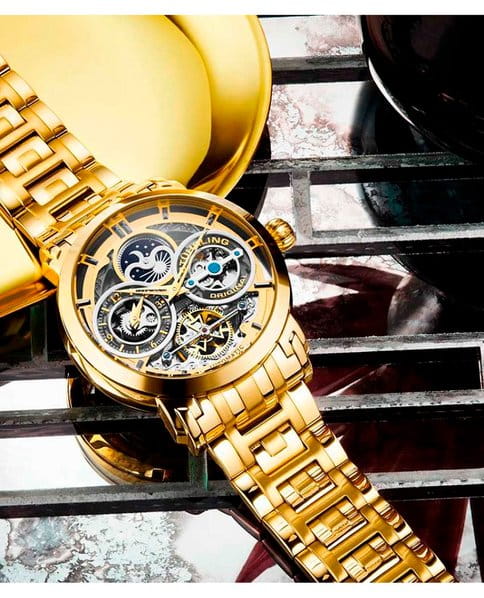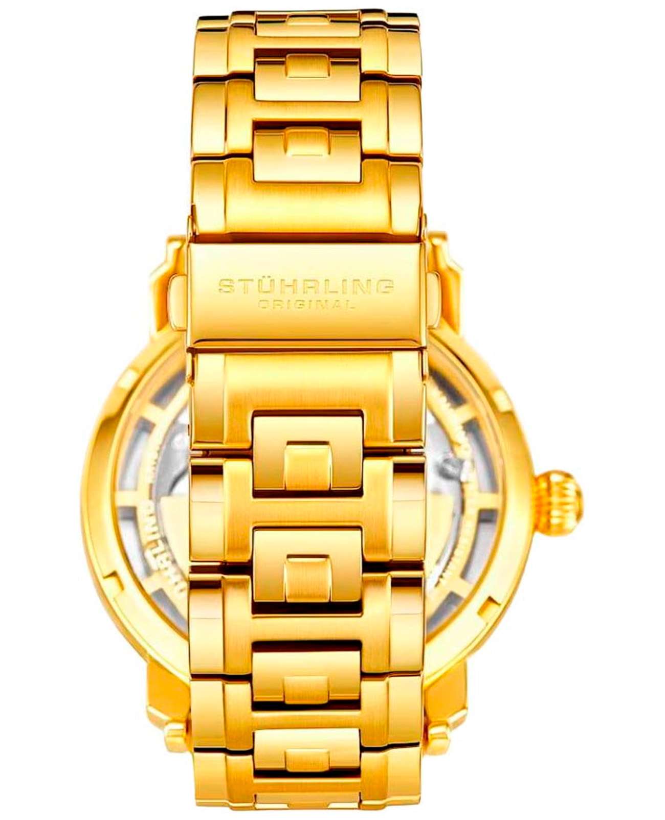 Мужские наручные часы Stührling Original 371B.03 из коллекции Luciano Automatic Skeleton сочетают в себе классический дизайн и современные технологии . Модель оснащена механическим механизмом с автоподзаводом, что гарантирует точность хода без необходимости ручного завода . Корпус часов диаметром 47 мм изготовлен из нержавеющей стали с PVD-покрытиемPVDУльтратонкое покрытие наносится в технике вакуумного напыления, сочетает в себе нитрид титана особой прочности со слоем золота или оксида хрома. Несёт в себе декоративную или защитную функцию. под золото, что подчеркивает элегантность модели . Защиту циферблата обеспечивает прочное стекло KrysternaKrysternaKrysterna — инновационное стекло для наручных часов. Благодаря уникальной структуре, Krysterna объединяет ключевые преимущества двух материалов: твердость сапфира, защищающую от царапин, и гибкость минерального стекла, обеспечивающую устойчивость к деформациям. Такая комбинация делает его идеальным решением для часов, подверженных экстремальным нагрузкам, сохраняя при этом оптическую прозрачность., известное своей устойчивостью к царапинам и механическим повреждениям . Циферблат выполнен в стиле , что позволяет наблюдать за работой внутреннего механизма и демонстрирует сложность инженерного решения . Такой дизайн делает модель не только функциональной, но и стильной, привлекая внимание ценителей сложных технических решений. Браслет из того же материала на раскладной застёжкеРаскладная застёжкаТакой тип застёжки используется только на браслетах из металла. Она никогда не раскрывается полностью, происходит разделение на 2 и более частей. Раскладывающая застёжка снизит вероятность потери часов к минимуму.. Водонепроницаемость модели достигает 5 атмосфер (50 метров), что позволяет использовать их в повседневных условиях, включая контакт с водой, например, при мытье рук или дожде . Заводная головка с системой завинчивания обеспечивает дополнительную защиту механизма от внешних воздействий.
