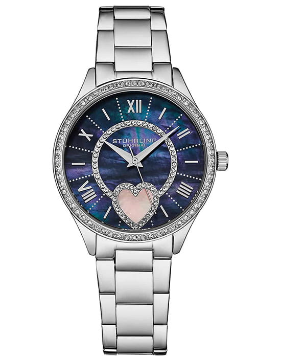 Stuhrling 4019.1 — утончённые женские часы, воплощающие романтику и изысканность в каждой линии. Корпус из нержавеющей стали. БезельБезельВнешний ободок, закрепляющий стекло. В спортивных часах так называется поворотное кольцо с делениями на циферблате, выполняет роль таймера – замеряет отрезки времени на шкале. Неподвижный безель – элемент декора. Однонаправленно вращающийся безель на дайверских часах позволяет фиксировать моменты погружения и выныривания на поверхность. украшен сияющими кристаллами, подчёркивающими женственный блеск модели. Переливчатый циферблат из перламутра с фигурным вырезом в форме сердца создаёт чарующий эффект и делает дизайн по-настоящему уникальным. Стрелки и римские метки выделяются на фоне глубокого синего оттенка, а стекло KrysternaKrysternaKrysterna — инновационное стекло для наручных часов. Благодаря уникальной структуре, Krysterna объединяет ключевые преимущества двух материалов: твердость сапфира, защищающую от царапин, и гибкость минерального стекла, обеспечивающую устойчивость к деформациям. Такая комбинация делает его идеальным решением для часов, подверженных экстремальным нагрузкам, сохраняя при этом оптическую прозрачность. надёжно защищает поверхность от царапин. Стальной браслет с раскладной застёжкойРаскладная застёжкаТакой тип застёжки используется только на браслетах из металла. Она никогда не раскрывается полностью, происходит разделение на 2 и более частей. Раскладывающая застёжка снизит вероятность потери часов к минимуму. обеспечивает удобную посадку и завершает изысканный облик. Stuhrling — это часы, которые подчеркивают элегантность, чувственность и уверенность своей обладательницы.