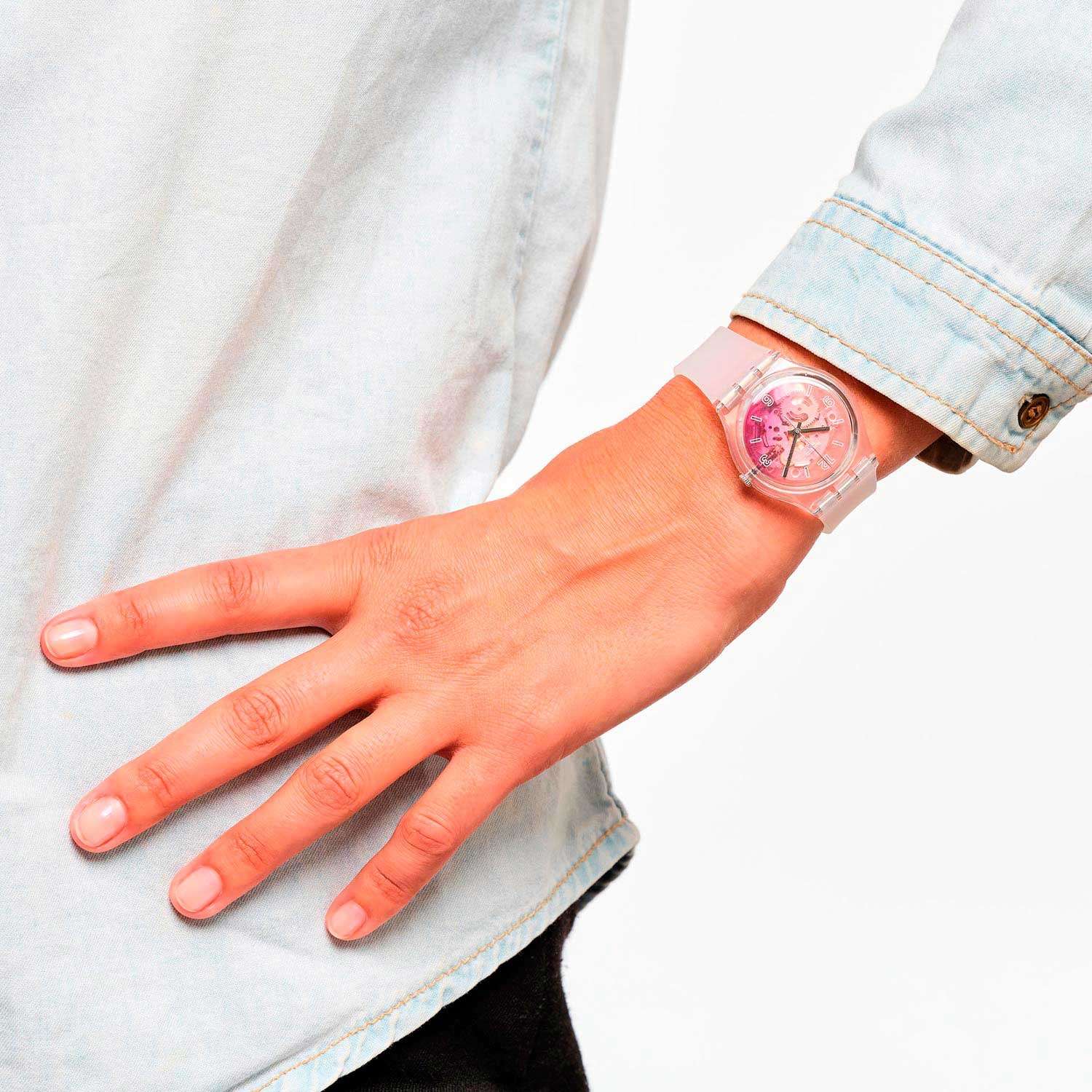Часы Swatch Gent Standard GE290 — это стильный и современный аксессуар для тех, кто ценит лёгкость и комфорт. Часы идеально подойдут как для мужчин, так и для женщин. Модель Gent Standard GE290 сочетает в себе кварцевый механизм, прозрачный ремешок из матового силикона и пластиковый корпус. Детали этих часов прекрасно дополнены розовым градиентным дизайном на циферблате. На часовую, минутную стрелки нанесено люминесцентное покрытиеЛюминесцентное покрытиеПозволяет считывать показания времени в темноте. Производители наносят на стрелки, часовые индексы, безель или поверхность циферблата светонакопительный состав, дающий холодное свечение., которое светится в темноте, создавая необычное изображение. Водозащита 30 метров делает часы практичными для повседневного использования. Эти часы подойдут для повседневного ношения и станут ярким акцентом в вашем наряде.