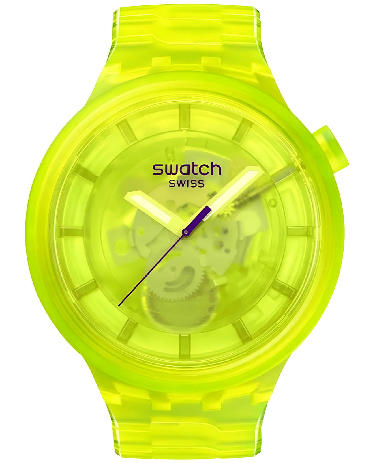 Часы Swatch SB05J103 — это стильный и современный аксессуар для тех, кто ценит лёгкость и комфорт. Часы идеально подойдут как для мужчин, так и для женщин.  Эти большие часы желтого цвета могут похвастаться прозрачным корпусом и циферблатом желтого оттенка, изготовленными из биосодержащих материалов, и браслетом с застежкой-бабочкойЗастёжка "бабочка"Такой вид застёжки дополняется предохранителями, помогающими избежать случайного раскрытия браслета. Обладают изящным исполнением. . Прозрачный желтый циферблат с биологическим покрытием позволяет видеть механизм, а на часовую и минутную стрелки нанесено люминесцентное покрытиеЛюминесцентное покрытиеПозволяет считывать показания времени в темноте. Производители наносят на стрелки, часовые индексы, безель или поверхность циферблата светонакопительный состав, дающий холодное свечение., которое светится в темноте, создавая необычное изображение. Водозащита 30 метров делает часы практичными для повседневного использования. Эти часы подойдут для повседневного ношения и станут ярким акцентом в вашем наряде.