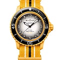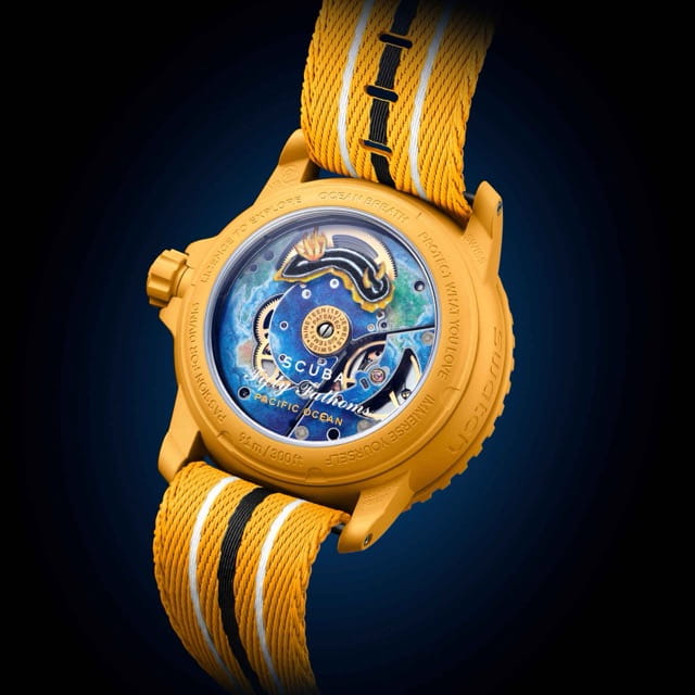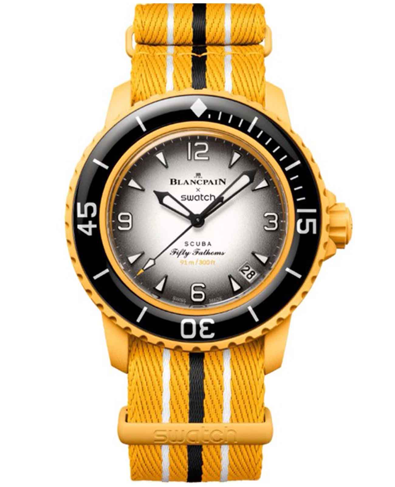 Часы Swatch Swatch Blancpain Fifty Fathoms Scuba SO35P100CS - часы отдают дань уважения модели Fifty Fathoms от Blancpain, первым настоящим часам для дайвинга. Оранжевый корпус и заводная головка часов изготовлены из материала Bioceramic. Слово "Swatch" выгравировано на внешней левой стороне корпуса. Металлический циферблат напечатан в несколько слоев цвета для создания эффекта градиента. Часовые индексы, часовая и минутная стрелки, а также шкала на безеле обогащены люминесцентным покрытиемЛюминесцентное покрытиеПозволяет считывать показания времени в темноте. Производители наносят на стрелки, часовые индексы, безель или поверхность циферблата светонакопительный состав, дающий холодное свечение. Grade A Super-LumiNova® для превосходной читаемости в темноте. Часы оснащены черным однонаправленным вращающимся безелемБезельВнешний ободок, закрепляющий стекло. В спортивных часах так называется поворотное кольцо с делениями на циферблате, выполняет роль таймера – замеряет отрезки времени на шкале. Неподвижный безель – элемент декора. Однонаправленно вращающийся безель на дайверских часах позволяет фиксировать моменты погружения и выныривания на поверхность. из материала Bioceramic и стеклом из биоматериалов. Механизм SISTEM51 виден благодаря прозрачному сапфировому стеклу и украшен цифровым изображением Тихого океана. На задней крышке часов можно найти пять вдохновляющих надписей: СТРАСТЬ К ДАЙВИНГУ – ЛИЦЕНЗИЯ НА ИССЛЕДОВАНИЕ – ДЫХАНИЕ ОКЕАНА – ЗАЩИЩАЙ ТО, ЧТО ЛЮБИШЬ и ПОГРУЗИСЬ. Ремешок NATO изготовлен из переработанных рыболовных сетей, извлеченных из моря. Пряжка и петли сделаны из материала Bioceramic.