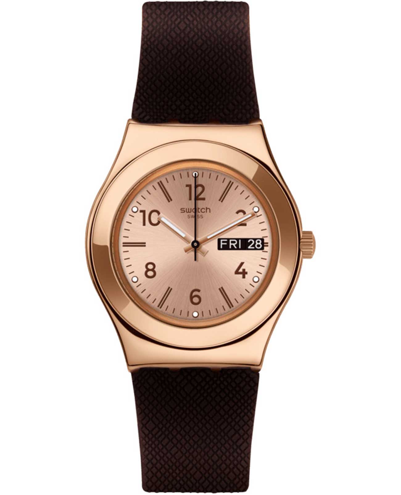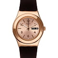 Часы Swatch YLG701 — это стильный и современный аксессуар для тех, кто ценит лёгкость и комфорт. Модель этих часов с прочным коричневым ремешком из силикона, а также корпусом и застежкой с PVDPVDУльтратонкое покрытие наносится в технике вакуумного напыления, сочетает в себе нитрид титана особой прочности со слоем золота или оксида хрома. Несёт в себе декоративную или защитную функцию. покрытием цвета розового золота, выглядит очень аппетитно. Картину довершает циферблат того же оттенка. На часовую, минутную стрелки нанесено люминесцентное покрытиеЛюминесцентное покрытиеПозволяет считывать показания времени в темноте. Производители наносят на стрелки, часовые индексы, безель или поверхность циферблата светонакопительный состав, дающий холодное свечение., которое светится в темноте, создавая необычное изображение. На золотистом циферблате с радиальной полировкой также имеется окошко даты. Водозащита 30 метров делает часы практичными для повседневного использования. Эти часы подойдут для повседневного ношения и станут ярким акцентом в вашем наряде.