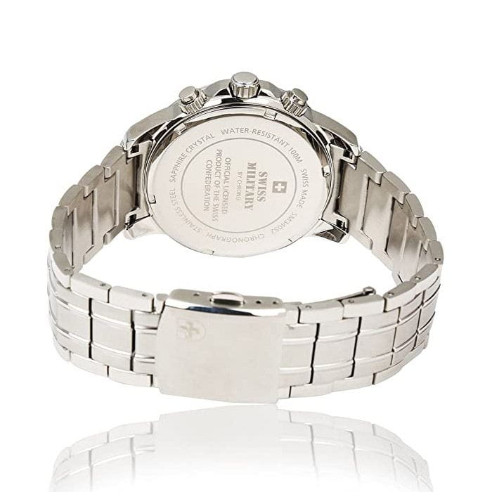 Стильные швейцарские наручные часы-хронографХронографФункция позволяет измерять отрезки времени с особой точностью: часы, минуты, секунды. Верным признаком хронографа является наличие на циферблате 3 дополнительных окошек-счётчиков. Swiss Military by Chrono SM34052.01 как нельзя лучше подойдут ценителям современных техно-решений. Вся корпусная часть, за исключением сапфирового стеклаСапфировое стеклоПрочный и надёжный материал из кристалла сапфира синтетического происхождения, характеризующийся особой твёрдостью и устойчивостью к царапинам и повреждениям., состоит из инновационной нержавейки. Функциональность часов дополняет тахометрическая шкала. Заводная головка с защитой. Браслет с раскладной застёжкойРаскладная застёжкаТакой тип застёжки используется только на браслетах из металла. Она никогда не раскрывается полностью, происходит разделение на 2 и более частей. Раскладывающая застёжка снизит вероятность потери часов к минимуму..
