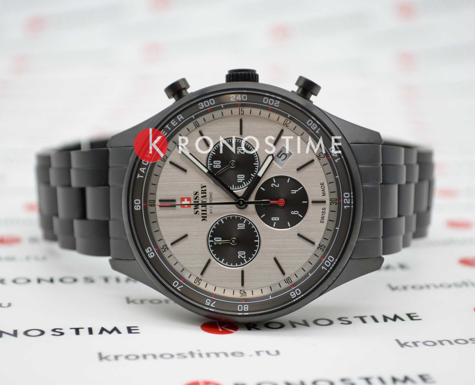 Мужские швейцарские наручные часы-хронографХронографФункция позволяет измерять отрезки времени с особой точностью: часы, минуты, секунды. Верным признаком хронографа является наличие на циферблате 3 дополнительных окошек-счётчиков. Swiss Military by Chrono SM34013.05, кварцевый механизм с высокой точностью. Класс водозащиты: 100 метров, позволит плавать, нырять и заниматься другими водными видами спорта. Стрелки с люминесцентным покрытиемЛюминесцентное покрытиеПозволяет считывать показания времени в темноте. Производители наносят на стрелки, часовые индексы, безель или поверхность циферблата светонакопительный состав, дающий холодное свечение.. Корпус часов изготовлен из стали. Минеральное стеклоМинеральное стеклоМинеральное стекло представляет собой искусственно выращенный минерал кварца. Такое стекло отличается особой устойчивостью к повреждениям и царапинам. Уступает по некоторым качествам сапфировому стеклу.. Браслет с раскладной застёжкойРаскладная застёжкаТакой тип застёжки используется только на браслетах из металла. Она никогда не раскрывается полностью, происходит разделение на 2 и более частей. Раскладывающая застёжка снизит вероятность потери часов к минимуму..