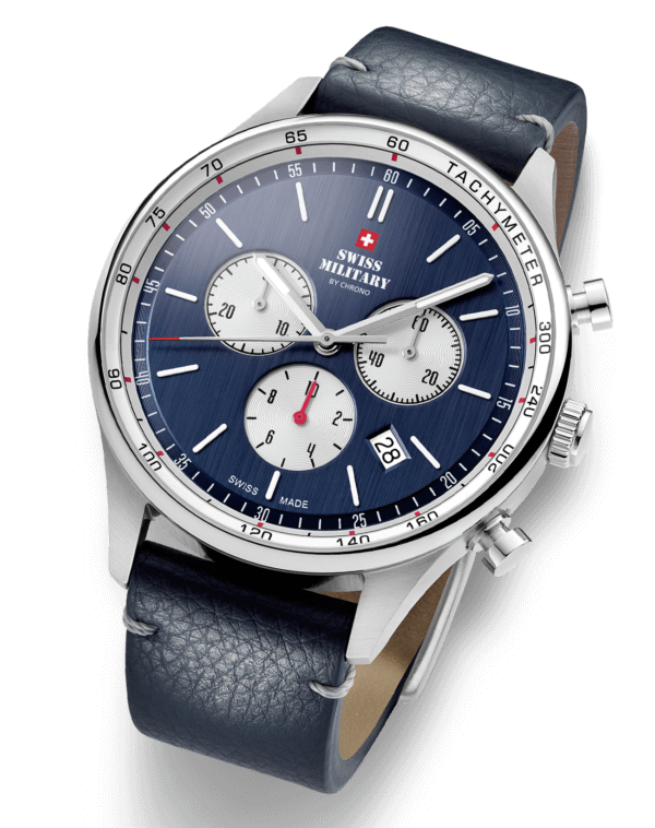 Мужские швейцарские наручные часы-хронографХронографФункция позволяет измерять отрезки времени с особой точностью: часы, минуты, секунды. Верным признаком хронографа является наличие на циферблате 3 дополнительных окошек-счётчиков. Swiss Military by Chrono SM34013.08, кварцевый механизм с высокой точностью. Класс водозащиты: 100 метров, позволит плавать, нырять и заниматься другими водными видами спорта. Стрелки с люминесцентным покрытиемЛюминесцентное покрытиеПозволяет считывать показания времени в темноте. Производители наносят на стрелки, часовые индексы, безель или поверхность циферблата светонакопительный состав, дающий холодное свечение.. Корпус часов изготовлен из стали. Минеральное стеклоМинеральное стеклоМинеральное стекло представляет собой искусственно выращенный минерал кварца. Такое стекло отличается особой устойчивостью к повреждениям и царапинам. Уступает по некоторым качествам сапфировому стеклу.. Ремешок с классической застежкой.