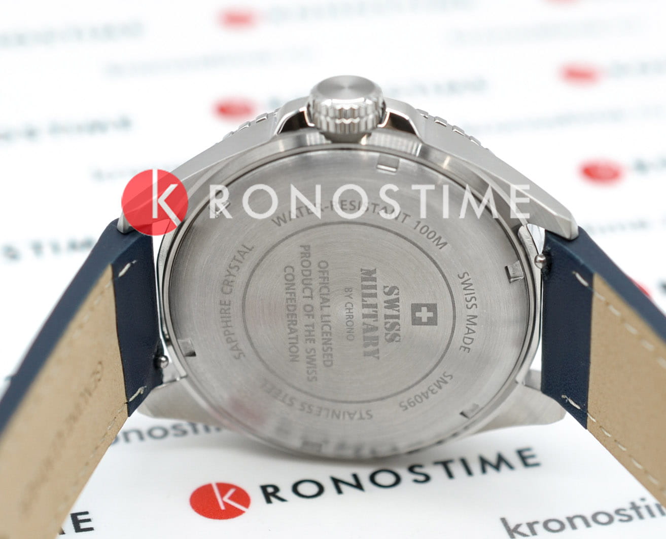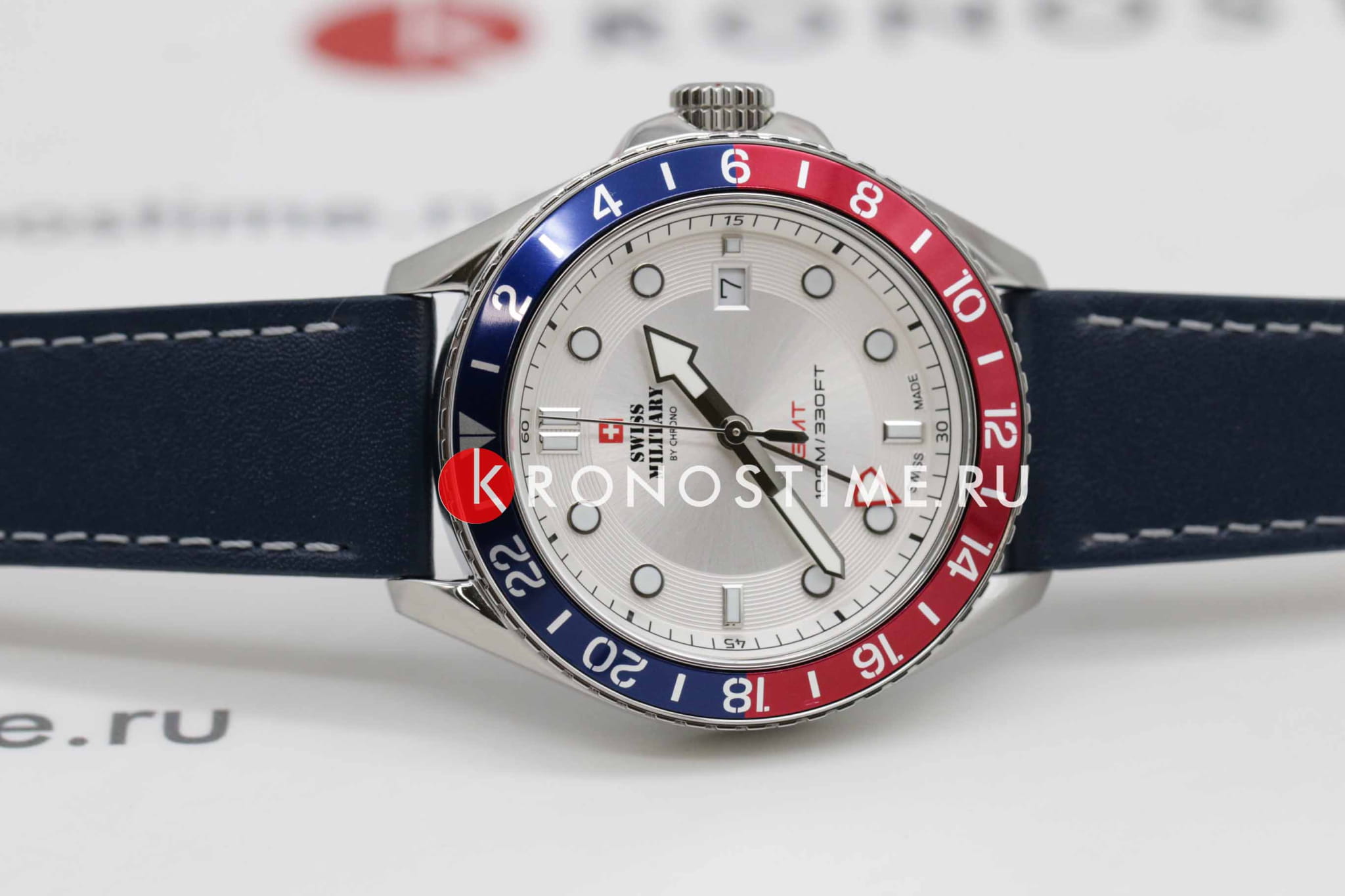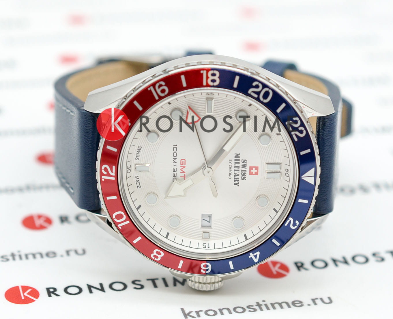 Мужские швейцарские часы Swiss Military by Chrono Quartz GMT SM34095.04, кварцевый механизм с высокой точностью. Cапфировое стеклоСапфировое стеклоПрочный и надёжный материал из кристалла сапфира синтетического происхождения, характеризующийся особой твёрдостью и устойчивостью к царапинам и повреждениям. устойчивое к появлению царапин и обладающее высокой прозрачностью. Корпус часов изготовлен из нержавеющей стали. Вращающийся безельБезельВнешний ободок, закрепляющий стекло. В спортивных часах так называется поворотное кольцо с делениями на циферблате, выполняет роль таймера – замеряет отрезки времени на шкале. Неподвижный безель – элемент декора. Однонаправленно вращающийся безель на дайверских часах позволяет фиксировать моменты погружения и выныривания на поверхность. из нержавеющей стали с PVDPVDУльтратонкое покрытие наносится в технике вакуумного напыления, сочетает в себе нитрид титана особой прочности со слоем золота или оксида хрома. Несёт в себе декоративную или защитную функцию. покрытием. Окошко даты находится в положении 3 часов. Стрелки с люминесцентным покрытиемЛюминесцентное покрытиеПозволяет считывать показания времени в темноте. Производители наносят на стрелки, часовые индексы, безель или поверхность циферблата светонакопительный состав, дающий холодное свечение.. Класс водозащиты: 100 метров, позволит плавать, нырять и заниматься другими водными видами спорта. Кожаный ремешок на стандартной застежке.