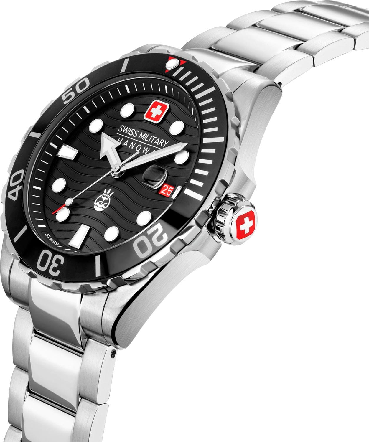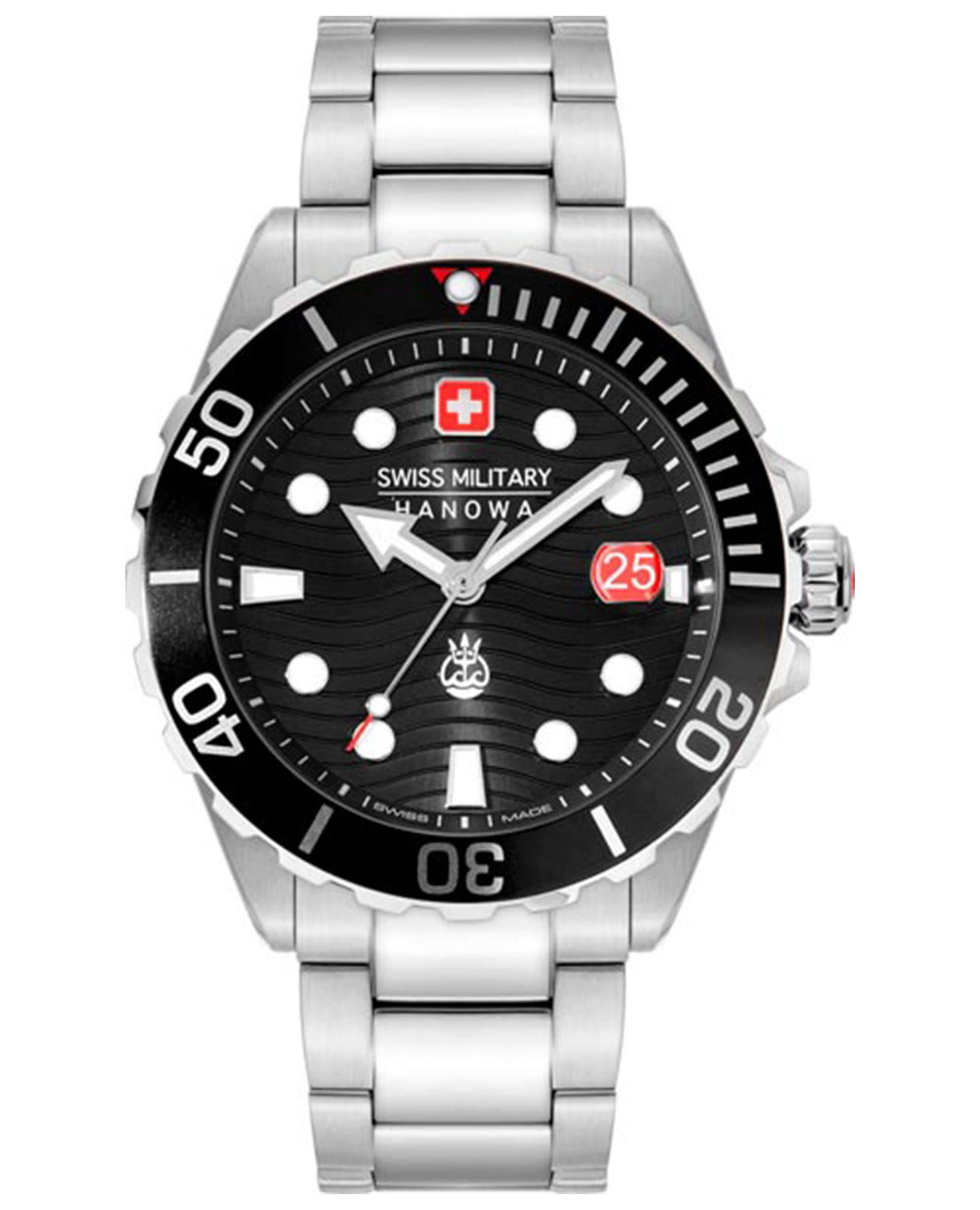 Швейцарские мужские дайверские часы Swiss Military Hanowa Offshore Diver II SMWGH2200301, кварцевый механизм с высокой точностью. Сапфировое стеклоСапфировое стеклоПрочный и надёжный материал из кристалла сапфира синтетического происхождения, характеризующийся особой твёрдостью и устойчивостью к царапинам и повреждениям. устойчивое к появлению царапин, обладающее высокой прозрачностью. Класс водозащиты: 200 метров, позволит плавать, нырять и заниматься другими водными видами спорта. Корпус часов изготовлен из стали с частичным с IP-покрытиемIP-покрытиеМетод ионного напыления. Демонстрирует повышенную устойчивость к истиранию, окислению и химическим веществам. Под воздействием высокого давления и температуры около 1500°C молекулы металла надёжно соединяются с частицами корпуса часов.. Рифленая заводная головка с защитой. Завинчивающаяся задняя крышка. Стальной браслет с раскладной застёжкойРаскладная застёжкаТакой тип застёжки используется только на браслетах из металла. Она никогда не раскрывается полностью, происходит разделение на 2 и более частей. Раскладывающая застёжка снизит вероятность потери часов к минимуму.. БезельБезельВнешний ободок, закрепляющий стекло. В спортивных часах так называется поворотное кольцо с делениями на циферблате, выполняет роль таймера – замеряет отрезки времени на шкале. Неподвижный безель – элемент декора. Однонаправленно вращающийся безель на дайверских часах позволяет фиксировать моменты погружения и выныривания на поверхность. вращается в одном направлении. Стилизованный циферблат. Метки в виде штрихов и точек с люминесцентным покрытиемЛюминесцентное покрытиеПозволяет считывать показания времени в темноте. Производители наносят на стрелки, часовые индексы, безель или поверхность циферблата светонакопительный состав, дающий холодное свечение.. Окошко даты с увеличительным стеклом.
