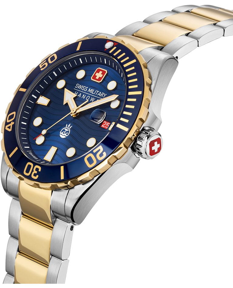 Швейцарские мужские дайверские часы Swiss Military Hanowa Offshore Diver II SMWGH2200360, кварцевый механизм с высокой точностью. Сапфировое стеклоСапфировое стеклоПрочный и надёжный материал из кристалла сапфира синтетического происхождения, характеризующийся особой твёрдостью и устойчивостью к царапинам и повреждениям. устойчивое к появлению царапин, обладающее высокой прозрачностью. Класс водозащиты: 200 метров, позволит плавать, нырять и заниматься другими водными видами спорта. Корпус часов изготовлен из стали. Рифленая заводная головка с защитой. Стальной браслет на раскладной застёжкеРаскладная застёжкаТакой тип застёжки используется только на браслетах из металла. Она никогда не раскрывается полностью, происходит разделение на 2 и более частей. Раскладывающая застёжка снизит вероятность потери часов к минимуму. с частичным с IP-покрытиемIP-покрытиеМетод ионного напыления. Демонстрирует повышенную устойчивость к истиранию, окислению и химическим веществам. Под воздействием высокого давления и температуры около 1500°C молекулы металла надёжно соединяются с частицами корпуса часов.. БезельБезельВнешний ободок, закрепляющий стекло. В спортивных часах так называется поворотное кольцо с делениями на циферблате, выполняет роль таймера – замеряет отрезки времени на шкале. Неподвижный безель – элемент декора. Однонаправленно вращающийся безель на дайверских часах позволяет фиксировать моменты погружения и выныривания на поверхность. с IP-покрытиемIP-покрытиеМетод ионного напыления. Демонстрирует повышенную устойчивость к истиранию, окислению и химическим веществам. Под воздействием высокого давления и температуры около 1500°C молекулы металла надёжно соединяются с частицами корпуса часов.. Стилизованный циферблат. Метки в виде штрихов и точек с люминесцентным покрытиемЛюминесцентное покрытиеПозволяет считывать показания времени в темноте. Производители наносят на стрелки, часовые индексы, безель или поверхность циферблата светонакопительный состав, дающий холодное свечение.. Окошко даты с увеличительным стеклом.