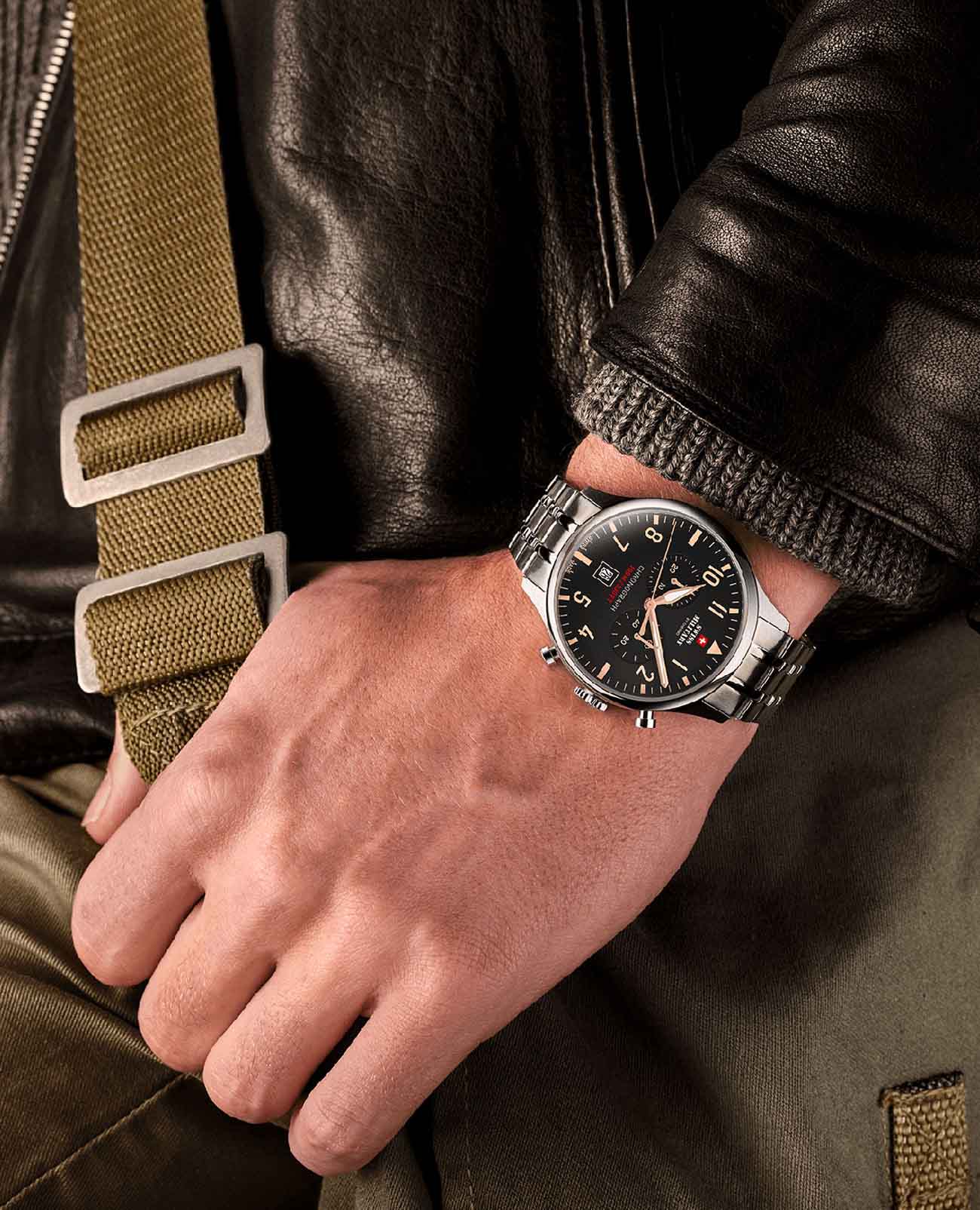 Мужские швейцарские часы-хронографХронографФункция позволяет измерять отрезки времени с особой точностью: часы, минуты, секунды. Верным признаком хронографа является наличие на циферблате 3 дополнительных окошек-счётчиков. с секундомеромСекундомерСекундоме́р — прибор, способный измерять интервалы времени с точностью до долей секунды. Swiss Military by Chrono Vintage Chronograph SM34098.04, кварцевый механизм с высокой точностью. Сапфировое стеклоСапфировое стеклоПрочный и надёжный материал из кристалла сапфира синтетического происхождения, характеризующийся особой твёрдостью и устойчивостью к царапинам и повреждениям. устойчивое к мелким механическим повреждениям. Корпус часов изготовлен из нержавеющей стали. На циферблате расположены два дополнительных индикатора и окошко даты. Окошко даты находится в положении 6 часов. Стрелки с люминесцентным покрытиемЛюминесцентное покрытиеПозволяет считывать показания времени в темноте. Производители наносят на стрелки, часовые индексы, безель или поверхность циферблата светонакопительный состав, дающий холодное свечение.. Класс водозащиты: 100 метров, позволит плавать, нырять и заниматься другими водными видами спорта. Стальной браслет на раскладной застёжкеРаскладная застёжкаТакой тип застёжки используется только на браслетах из металла. Она никогда не раскрывается полностью, происходит разделение на 2 и более частей. Раскладывающая застёжка снизит вероятность потери часов к минимуму..