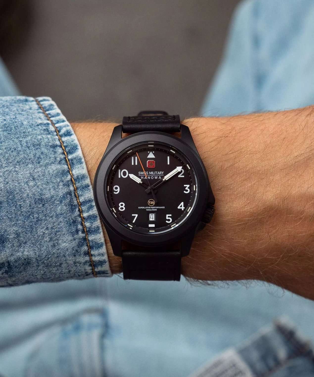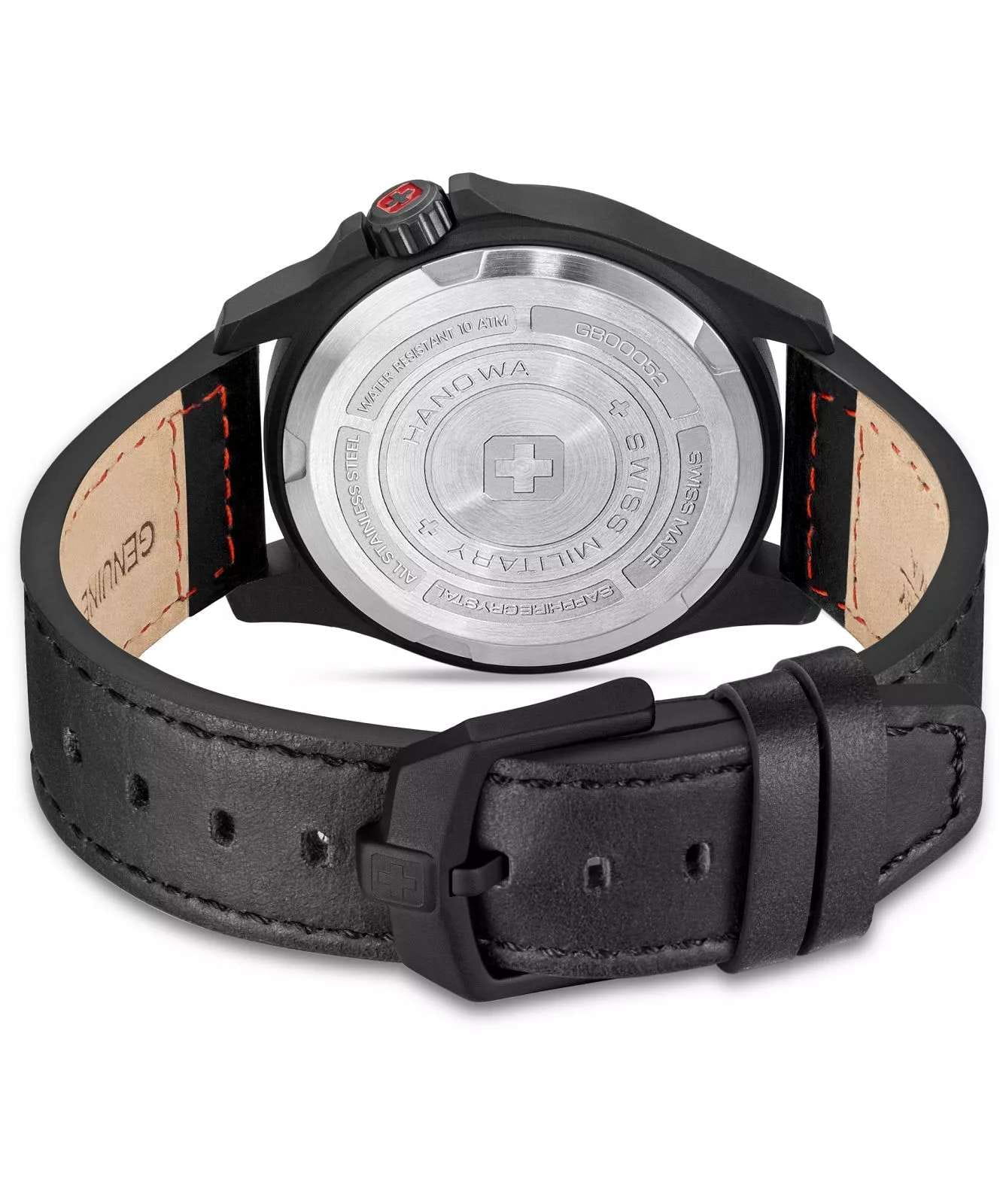 Мужские кварцевые часы Swiss Military Hanowa — это прочный и стильный аксессуар, вдохновлённый классическими полевыми моделями. Корпус диаметром 42 мм выполнен из нержавеющей стали с PVD-покрытиемPVDУльтратонкое покрытие наносится в технике вакуумного напыления, сочетает в себе нитрид титана особой прочности со слоем золота или оксида хрома. Несёт в себе декоративную или защитную функцию.. Циферблат чёрного цвета оформлен индексами и стрелками. Циферблат защищён сапфировым стекломСапфировое стеклоПрочный и надёжный материал из кристалла сапфира синтетического происхождения, характеризующийся особой твёрдостью и устойчивостью к царапинам и повреждениям.. Механизм — швейцарское кварцевое движение Ronda 515 (Swiss Made). Часы оснащены чёрным кожаным ремешком с матовой текстурой на классической пряжке. Водонепроницаемость 100 м позволяет использовать часы для плавания и повседневного ношения. Идеальный выбор для тех, кто ценит швейцарское качество и надёжность.