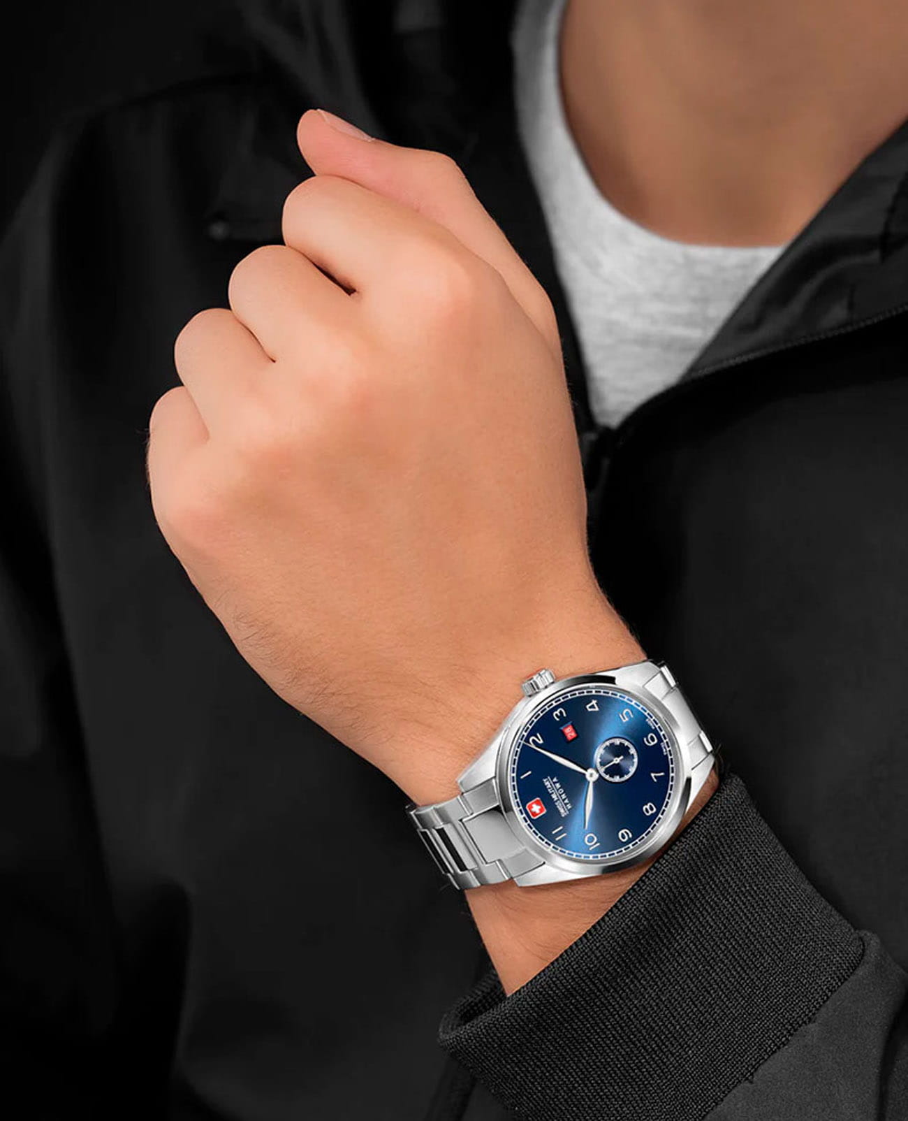 Мужские швейцарские часы с сапфировым стекломСапфировое стеклоПрочный и надёжный материал из кристалла сапфира синтетического происхождения, характеризующийся особой твёрдостью и устойчивостью к царапинам и повреждениям. Swiss Military Hanowa Lynx SMWGH0000705, кварцевый механизм с высокой точностью. Сапфировое стеклоСапфировое стеклоПрочный и надёжный материал из кристалла сапфира синтетического происхождения, характеризующийся особой твёрдостью и устойчивостью к царапинам и повреждениям. устойчивое к появлению царапин, обладающее высокой прозрачностью. Корпус часов изготовлен из стали. Центральные часовая и минутная стрелки, секундная стрелка вынесена на малый циферблат. Окошко даты находится в положении 3 часов. Класс водозащиты: 100 метров, позволит плавать, нырять и заниматься другими водными видами спорта. Стальной браслет на раскладной застёжкеРаскладная застёжкаТакой тип застёжки используется только на браслетах из металла. Она никогда не раскрывается полностью, происходит разделение на 2 и более частей. Раскладывающая застёжка снизит вероятность потери часов к минимуму..