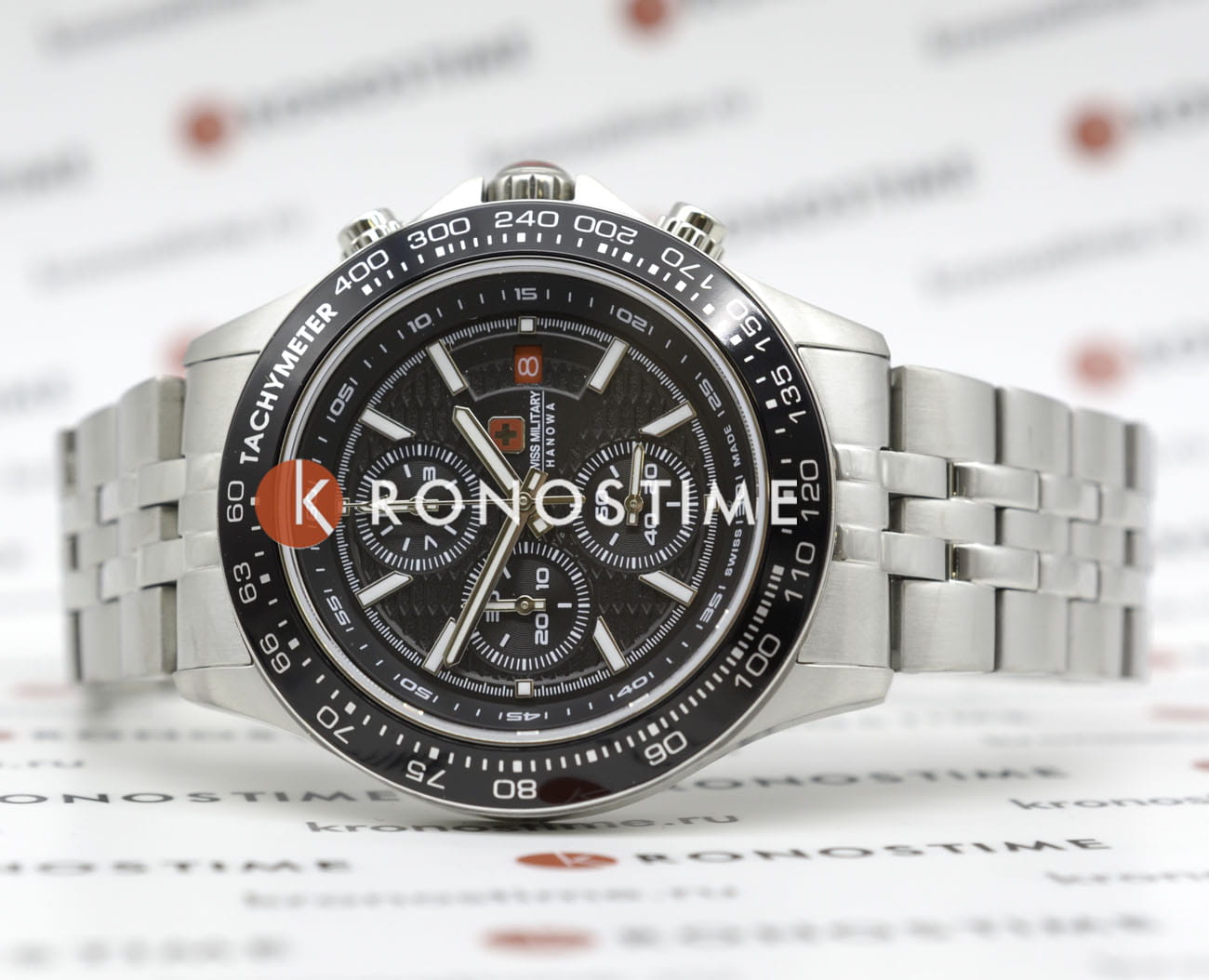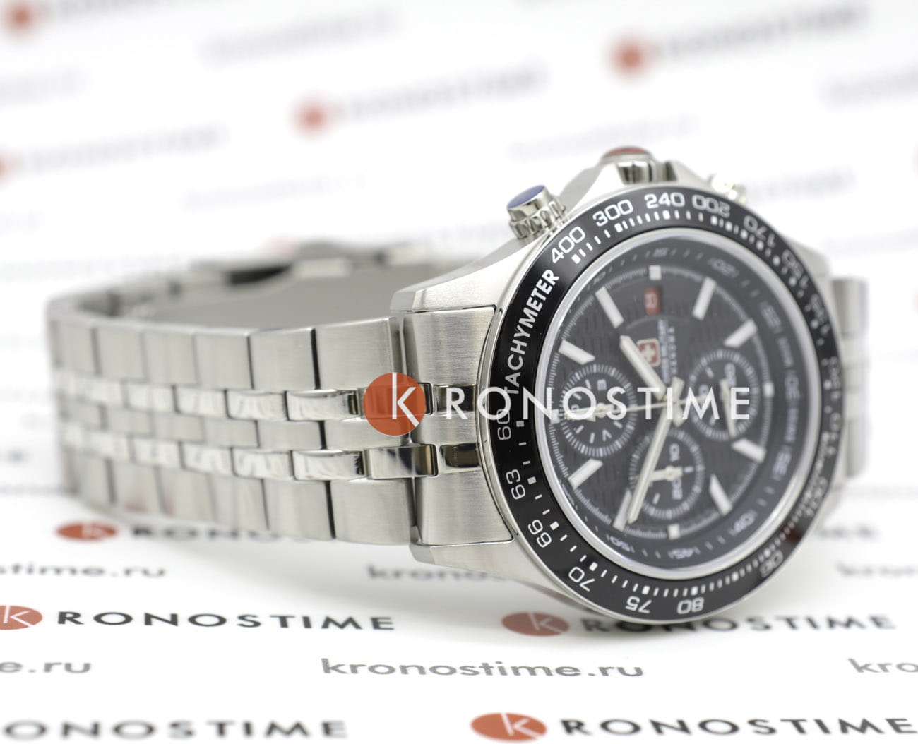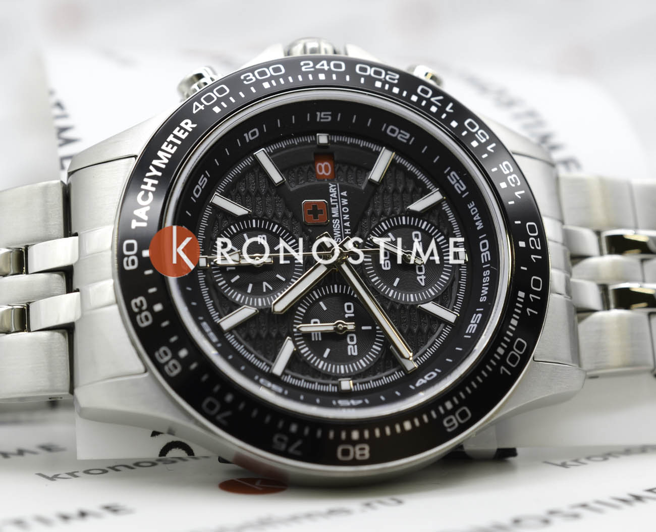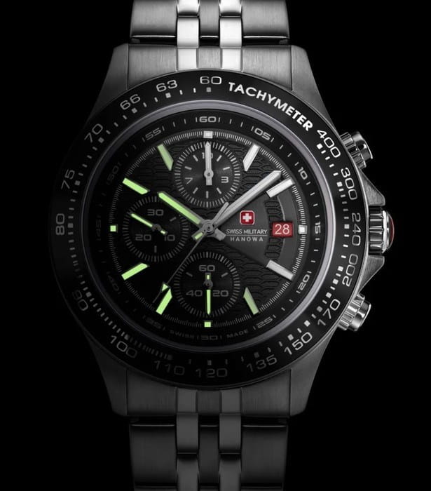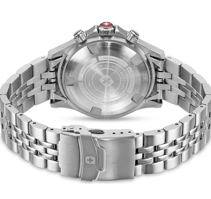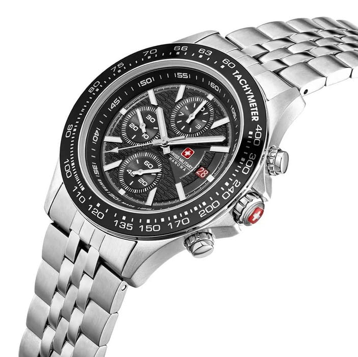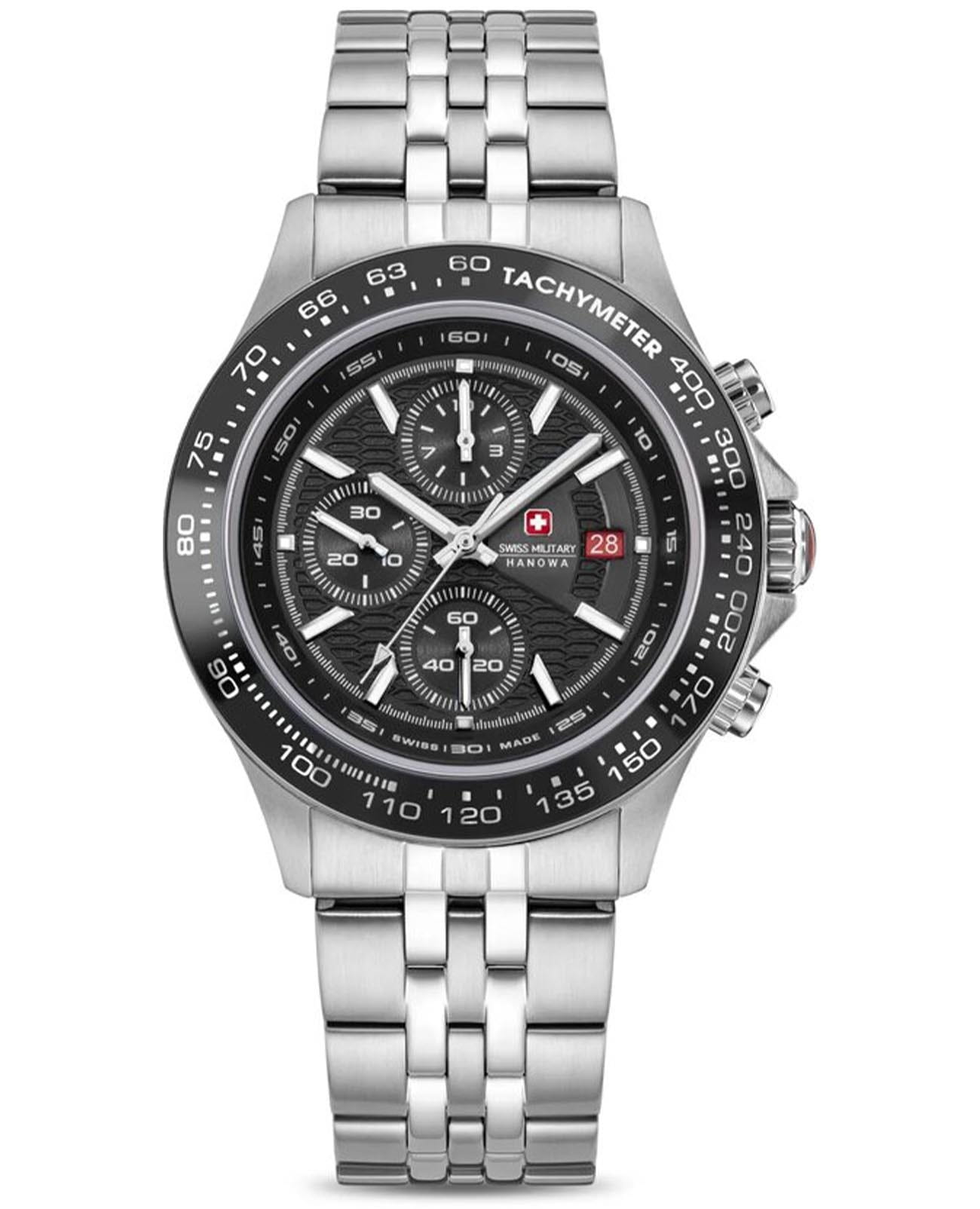 Мужские швейцарские часы-хронографХронографФункция позволяет измерять отрезки времени с особой точностью: часы, минуты, секунды. Верным признаком хронографа является наличие на циферблате 3 дополнительных окошек-счётчиков. Swiss Military Hanowa SMWGI0003402, кварцевый механизм с высокой точностью. Сапфировое стеклоСапфировое стеклоПрочный и надёжный материал из кристалла сапфира синтетического происхождения, характеризующийся особой твёрдостью и устойчивостью к царапинам и повреждениям. устойчивое к появлению царапин, обладающее высокой прозрачностью. Класс водозащиты: 100 метров, позволит плавать, нырять и заниматься другими водными видами спорта. Корпус часов изготовлен из стали. Стальной браслет на раскладной застёжкеРаскладная застёжкаТакой тип застёжки используется только на браслетах из металла. Она никогда не раскрывается полностью, происходит разделение на 2 и более частей. Раскладывающая застёжка снизит вероятность потери часов к минимуму.. БезельБезельВнешний ободок, закрепляющий стекло. В спортивных часах так называется поворотное кольцо с делениями на циферблате, выполняет роль таймера – замеряет отрезки времени на шкале. Неподвижный безель – элемент декора. Однонаправленно вращающийся безель на дайверских часах позволяет фиксировать моменты погружения и выныривания на поверхность. с тахиметромТахиметрРазмеченная шкала, располагается на ободке или безеле часов. Тахиметр позволяет рассчитать скорость на определённом участке пути, расстояние измеряется в километрах или милях. изготовлен из нержавеющей стали с IP-покрытиемIP-покрытиеМетод ионного напыления. Демонстрирует повышенную устойчивость к истиранию, окислению и химическим веществам. Под воздействием высокого давления и температуры около 1500°C молекулы металла надёжно соединяются с частицами корпуса часов.. Окошко даты находится в положении 3 часа.