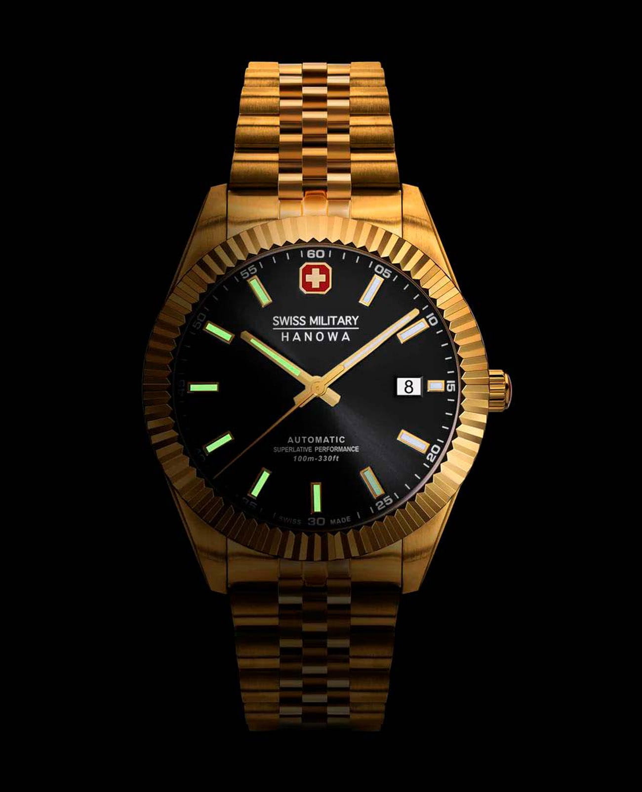 Мужские механические швейцарские часы с автоподзаводом Swiss Military Hanowa Diligenter SMWGL0002110. Сапфировое стеклоСапфировое стеклоПрочный и надёжный материал из кристалла сапфира синтетического происхождения, характеризующийся особой твёрдостью и устойчивостью к царапинам и повреждениям. устойчивое к появлению царапин, обладающее высокой прозрачностью. Корпус из нержавеющей стали с IP-покрытиемIP-покрытиеМетод ионного напыления. Демонстрирует повышенную устойчивость к истиранию, окислению и химическим веществам. Под воздействием высокого давления и температуры около 1500°C молекулы металла надёжно соединяются с частицами корпуса часов.. Стрелки и метки с люминесцентным покрытиемЛюминесцентное покрытиеПозволяет считывать показания времени в темноте. Производители наносят на стрелки, часовые индексы, безель или поверхность циферблата светонакопительный состав, дающий холодное свечение.. Циферблат выполнен по технологии Sunray (солнечные лучи). Окошко даты находится в положении 3 часов. Класс водозащиты: 100 метров, позволит плавать, нырять и заниматься другими водными видами спорта. Стальной браслет с IP-покрытиемIP-покрытиеМетод ионного напыления. Демонстрирует повышенную устойчивость к истиранию, окислению и химическим веществам. Под воздействием высокого давления и температуры около 1500°C молекулы металла надёжно соединяются с частицами корпуса часов. на раскладной застёжкеРаскладная застёжкаТакой тип застёжки используется только на браслетах из металла. Она никогда не раскрывается полностью, происходит разделение на 2 и более частей. Раскладывающая застёжка снизит вероятность потери часов к минимуму..