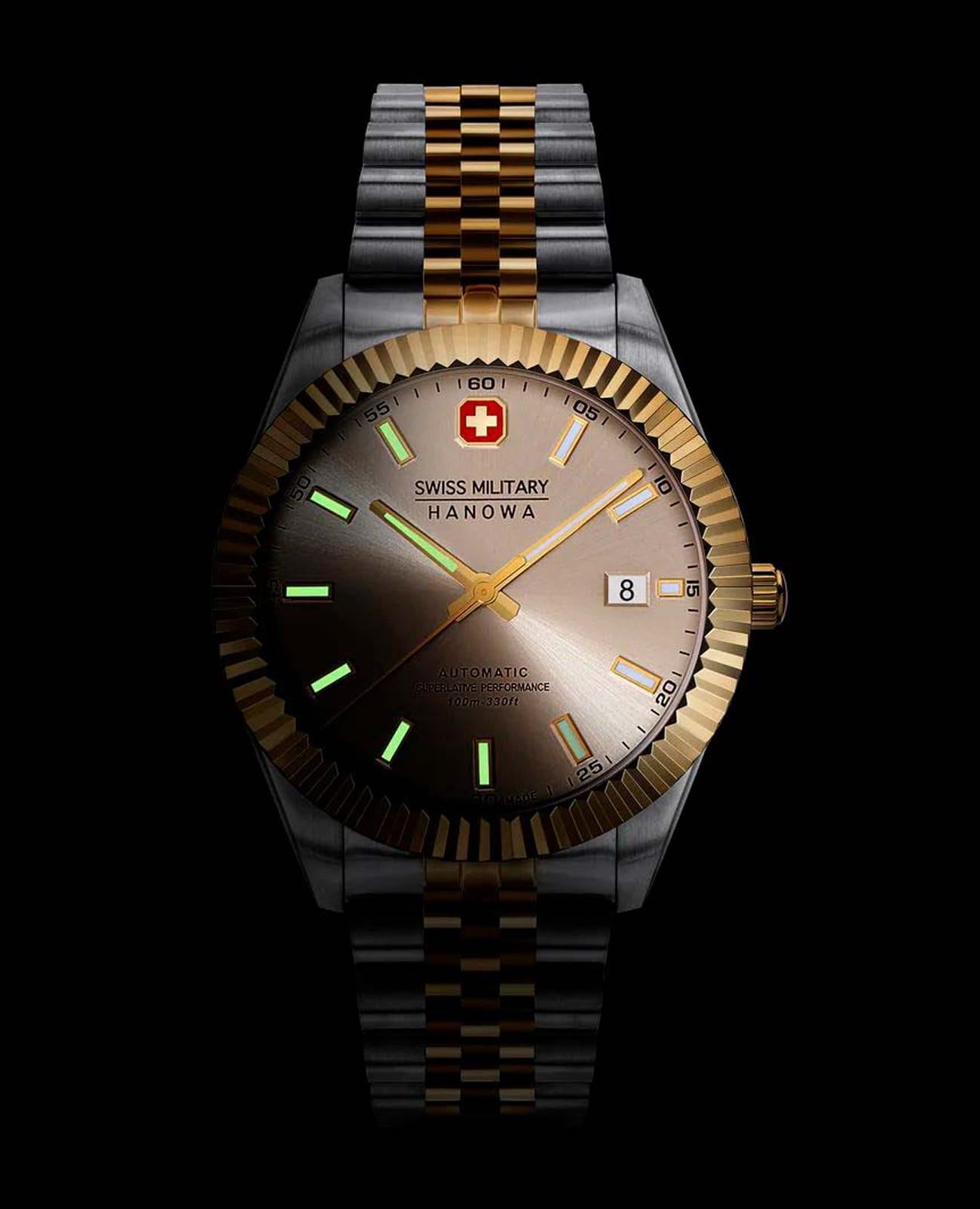 Мужские механические швейцарские часы с автоподзаводом Swiss Military Hanowa Diligenter SMWGL0002160. Сапфировое стеклоСапфировое стеклоПрочный и надёжный материал из кристалла сапфира синтетического происхождения, характеризующийся особой твёрдостью и устойчивостью к царапинам и повреждениям. устойчивое к появлению царапин, обладающее высокой прозрачностью. Корпус из нержавеющей стали. БезельБезельВнешний ободок, закрепляющий стекло. В спортивных часах так называется поворотное кольцо с делениями на циферблате, выполняет роль таймера – замеряет отрезки времени на шкале. Неподвижный безель – элемент декора. Однонаправленно вращающийся безель на дайверских часах позволяет фиксировать моменты погружения и выныривания на поверхность. из нержавеющей стали с IP-покрытиемIP-покрытиеМетод ионного напыления. Демонстрирует повышенную устойчивость к истиранию, окислению и химическим веществам. Под воздействием высокого давления и температуры около 1500°C молекулы металла надёжно соединяются с частицами корпуса часов.. Стрелки и метки с люминесцентным покрытиемЛюминесцентное покрытиеПозволяет считывать показания времени в темноте. Производители наносят на стрелки, часовые индексы, безель или поверхность циферблата светонакопительный состав, дающий холодное свечение.. Циферблат выполнен по технологии Sunray (солнечные лучи). Окошко даты находится в положении 3 часов. Класс водозащиты: 100 метров, позволит плавать, нырять и заниматься другими водными видами спорта. Стальной браслет с частичным IP-покрытиемIP-покрытиеМетод ионного напыления. Демонстрирует повышенную устойчивость к истиранию, окислению и химическим веществам. Под воздействием высокого давления и температуры около 1500°C молекулы металла надёжно соединяются с частицами корпуса часов. на раскладной застёжкеРаскладная застёжкаТакой тип застёжки используется только на браслетах из металла. Она никогда не раскрывается полностью, происходит разделение на 2 и более частей. Раскладывающая застёжка снизит вероятность потери часов к минимуму..