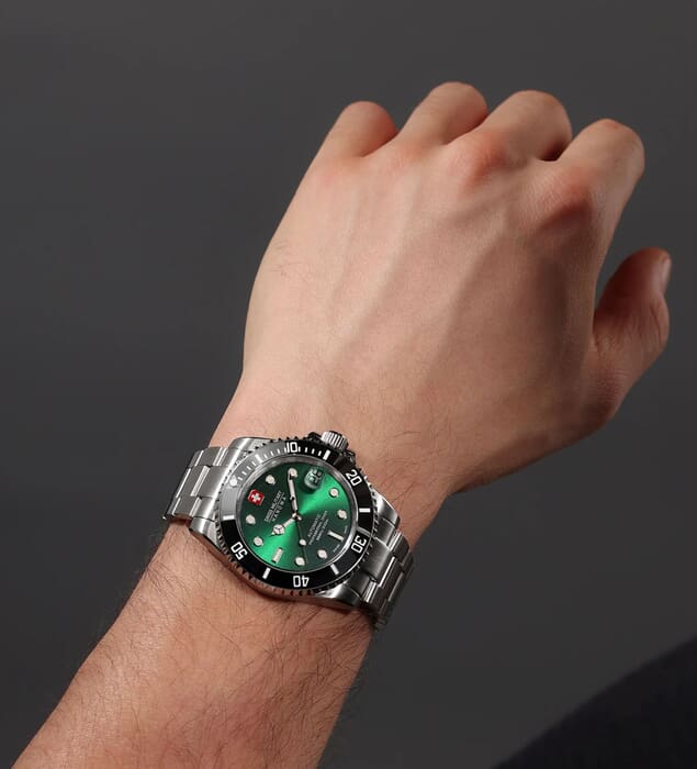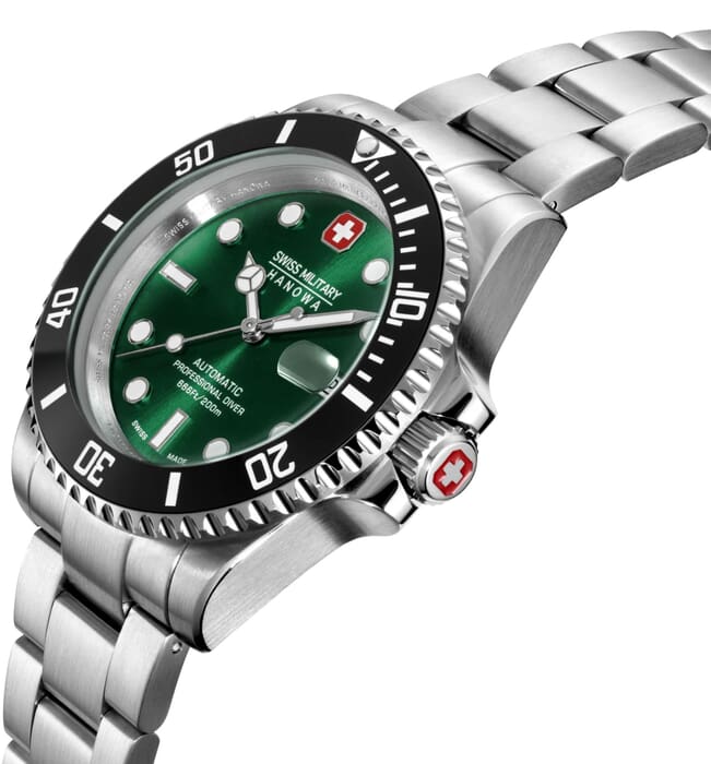 Мужские швейцарские часы Swiss Military Sealord SMWGL0006302 – это великолепные, стильные автоматические часы швейцарского производства, которые идеально подходят для дайвинга. Корпус из нержавеющей стали диаметром 41 мм сбалансирован и элегантен. Сапфировое стеклоСапфировое стеклоПрочный и надёжный материал из кристалла сапфира синтетического происхождения, характеризующийся особой твёрдостью и устойчивостью к царапинам и повреждениям. с антибликовым покрытием защищает циферблат от царапин и обеспечивает отличную читаемость при любом освещении. Браслет из нержавеющей стали с раскладной застёжкойРаскладная застёжкаТакой тип застёжки используется только на браслетах из металла. Она никогда не раскрывается полностью, происходит разделение на 2 и более частей. Раскладывающая застёжка снизит вероятность потери часов к минимуму. идеально дополняют дизайн часов, обеспечивая комфортное ношение. Люминесцентное покрытиеЛюминесцентное покрытиеПозволяет считывать показания времени в темноте. Производители наносят на стрелки, часовые индексы, безель или поверхность циферблата светонакопительный состав, дающий холодное свечение. стрелок и меток позволит вам следить за временем даже в полной темноте. Вращающийся керамический безельБезельВнешний ободок, закрепляющий стекло. В спортивных часах так называется поворотное кольцо с делениями на циферблате, выполняет роль таймера – замеряет отрезки времени на шкале. Неподвижный безель – элемент декора. Однонаправленно вращающийся безель на дайверских часах позволяет фиксировать моменты погружения и выныривания на поверхность.. Индикатор даты в положении «3 часа». Водонепроницаемость до 200 метров идеально подходят для дайвинга. Автоматический швейцарский механизм Soprod P024, который основан на знаменитом механизме ETA 2824.