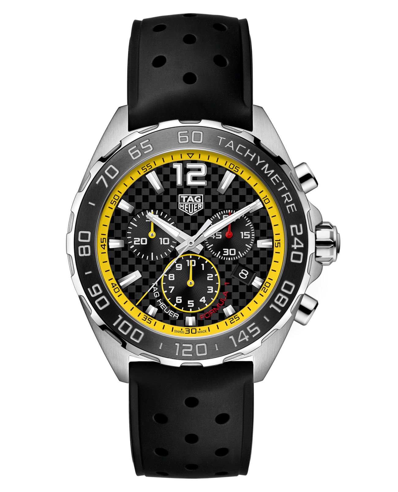 Они выделяются индикатором текущих секунд в черном и красном цвете и 60-секундной/минутной разметкой на фланце в ярко-желтых тонах. Модель оснащена кварцевым механизмом. Швейцарские мужские часы с хронографом TAG Heuer Formula 1 CAZ101AC.FT8024, кварцевый механизм с высокой точностью. Сапфировое стекло устойчивое к появлению царапин, обладающее высокой прозрачностью. Класс водозащиты: 200 метров, позволит плавать, нырять и заниматься другими водными видами спорта. Корпус часов изготовлен из стали, серебристого цвета.