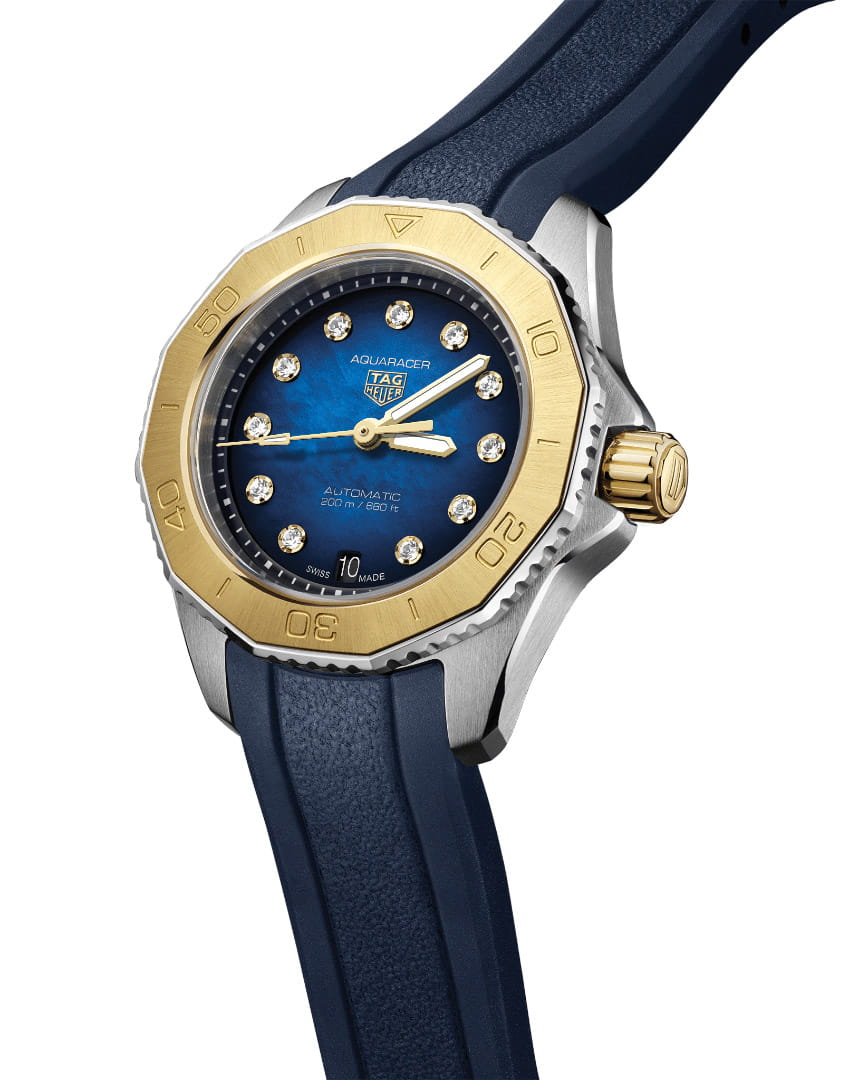 Часы TAG Heuer Aquaracer Professional 200 WBP2450.FT6215. Сочетая в себе прочность желтого золота и универсальность синего каучукового ремешка, этот роскошный TAG Heuer Aquaracer отличается спортивной элегантностью. Сверкающие бриллианты диаметром 1,4 мм (0,107 карата). Очень разборчивые благодаря светящимся позолоченным стрелкам и индексам, великолепно контрастирующим с темно-синим циферблатом, эти эффектные часы готовы к крайностям.