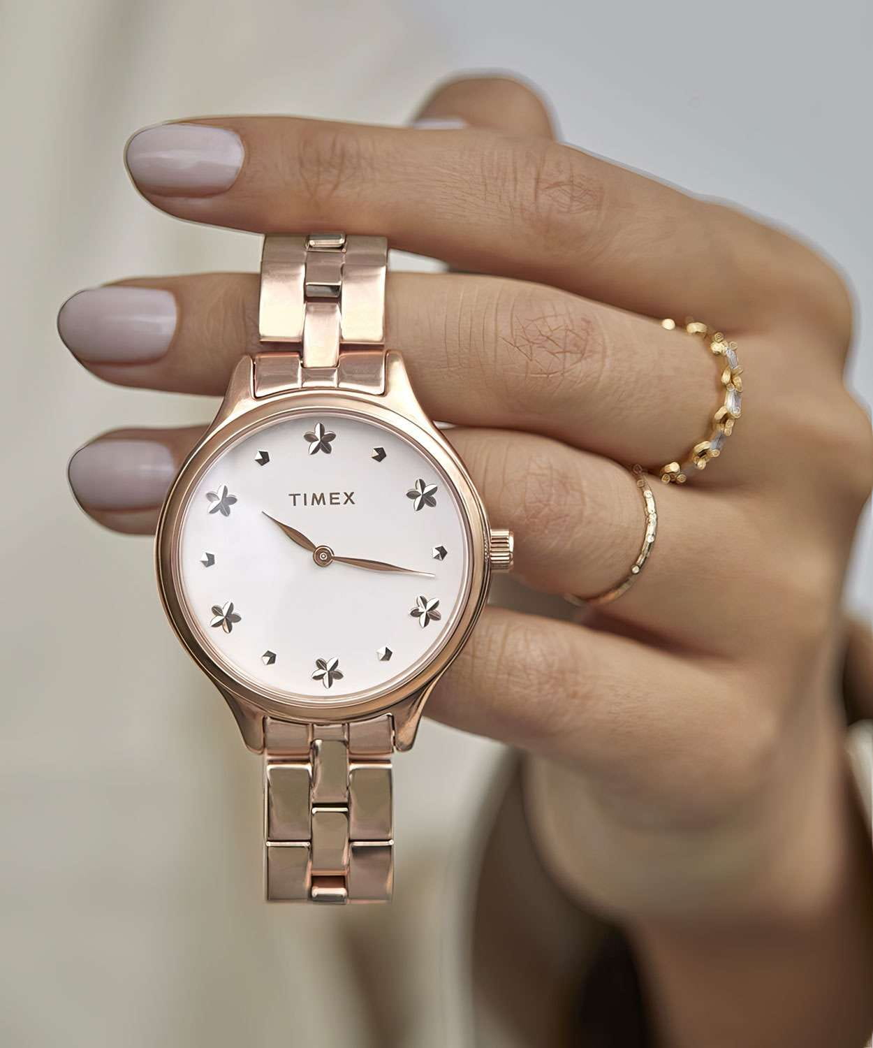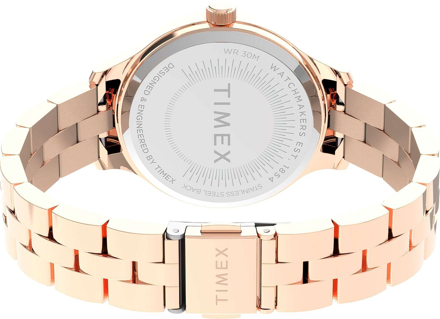 Изысканные часы Timex TW2V23400 станут прекрасным дополнением вашего образа и подчеркнут вашу индивидуальность. Эти часы, разработанные в США, сочетают в себе элегантность и современные технологии. Корпус часов выполнен из латуни с розовым PVDPVDУльтратонкое покрытие наносится в технике вакуумного напыления, сочетает в себе нитрид титана особой прочности со слоем золота или оксида хрома. Несёт в себе декоративную или защитную функцию. покрытием, что придаёт им утончённый и стильный вид. Розовый циферблат сдержанного дизайна украшен метками в виде точек и цветков, что добавляет часам особого шарма. Листовидные стрелки в стиле Feuille подчёркивают изящество дизайна, а отсутствие секундной стрелки делает облик часов ещё более минималистичным. Часы оснащены надёжным кварцевым механизмом, который обеспечивает точный ход и долговечность. Минеральное стеклоМинеральное стеклоМинеральное стекло представляет собой искусственно выращенный минерал кварца. Такое стекло отличается особой устойчивостью к повреждениям и царапинам. Уступает по некоторым качествам сапфировому стеклу. защищает циферблат от царапин и повреждений, сохраняя его первозданный вид на протяжении долгого времени. Рифлёная заводная головка добавляет удобства в использовании. Водозащита 30WR позволяет не беспокоиться о случайных брызгах воды, делая эти часы подходящими для повседневного ношения. Стальной браслет с розовым PVDPVDУльтратонкое покрытие наносится в технике вакуумного напыления, сочетает в себе нитрид титана особой прочности со слоем золота или оксида хрома. Несёт в себе декоративную или защитную функцию. покрытием и раскладной застёжкойРаскладная застёжкаТакой тип застёжки используется только на браслетах из металла. Она никогда не раскрывается полностью, происходит разделение на 2 и более частей. Раскладывающая застёжка снизит вероятность потери часов к минимуму. обеспечивает комфорт и надёжность, прекрасно дополняя общий дизайн часов. С диаметром корпуса 36 мм и шириной браслета 14 мм, эти часы идеально подходят для изящного запястья, становясь акцентом любого наряда. Эти часы — отличный выбор для тех, кто ищет стильный и функциональный аксессуар.