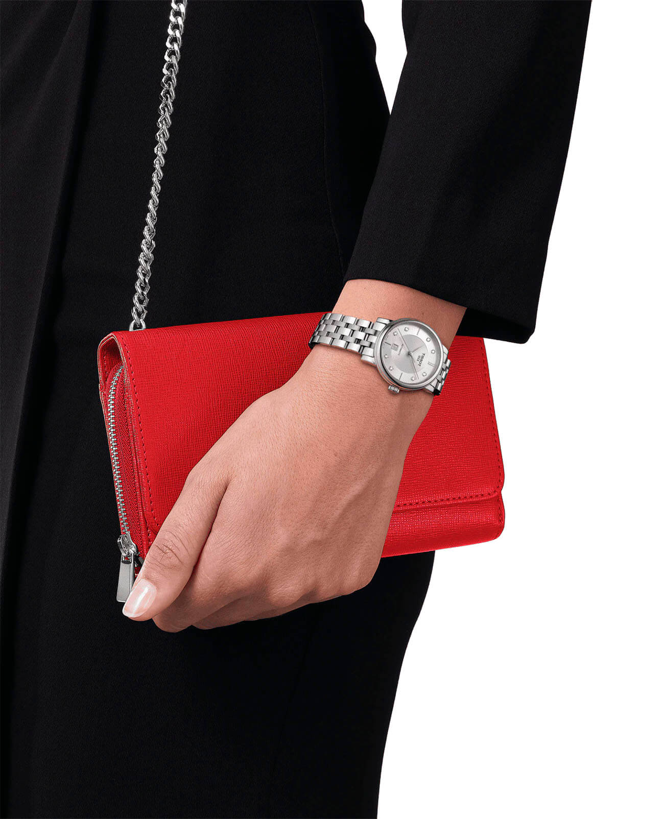 Классический белый циферблат с серебристыми индексами и удлинёнными стрелками позволяет использовать в одежде яркие и кислотные оттенки. Дополнительную красоту в облик привносят бриллианты. Наручные часы имеют стальной браслет из нержавеющей стали с отличительными продольными звеньями. Работа обеспечивается за счёт автоматического механизма ETA 2671 с запасом хода 38 часов. Прозрачная задняя крышка. Водостойкость 50 метров. Апертура даты. . Габариты: 30 x 30 x 9,5 мм.