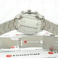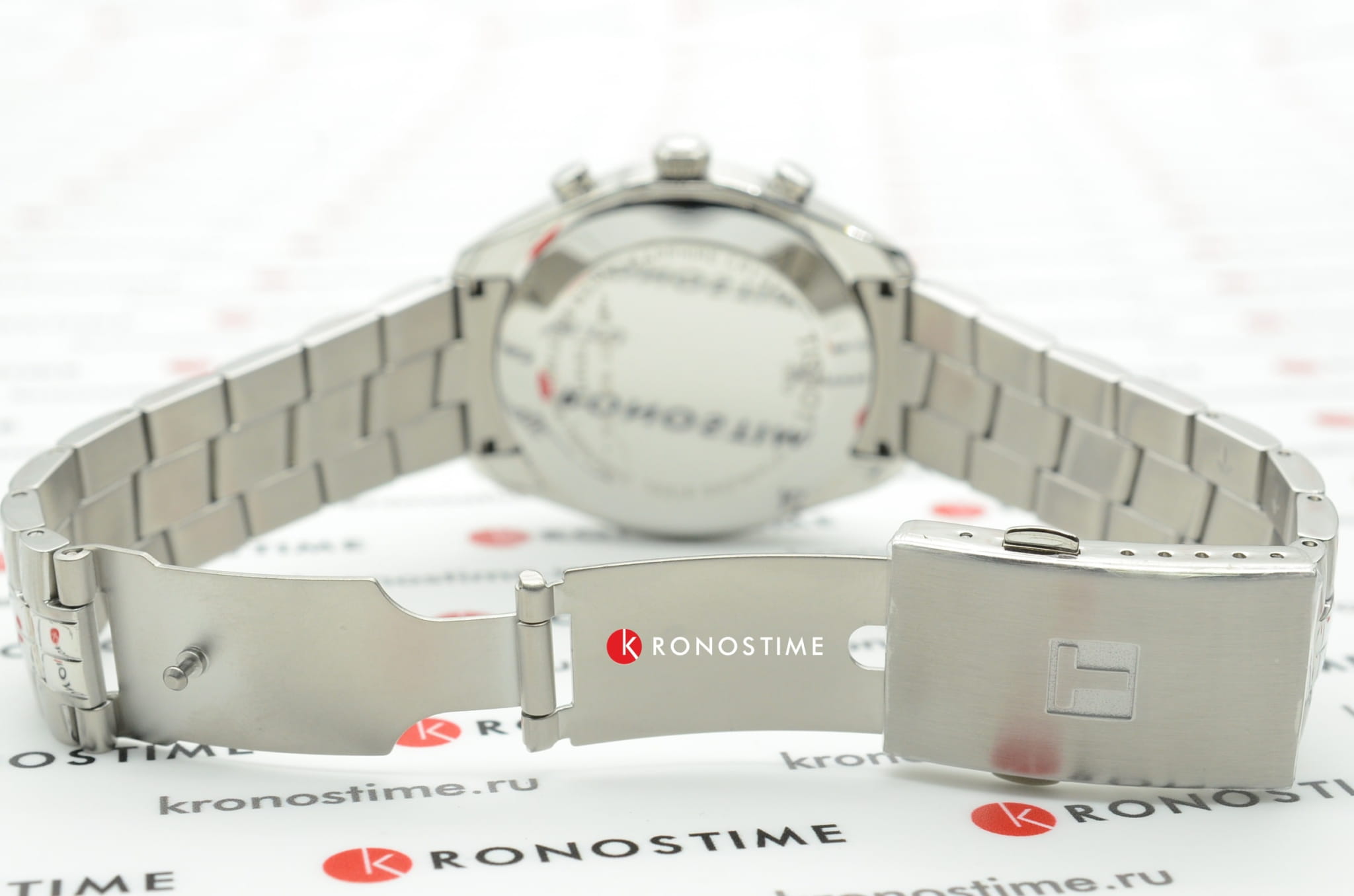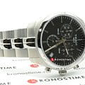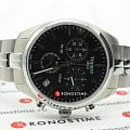 Часы швейцарского качества с чёрным циферблатом имеют три дополнительных окошка. Модель с хронографом и секундомером оснащена кварцевым механизмом ETA G10.211, который заключён в ударопрочный корпус из нержавеющей стали. Сапфировое стекло отличается устойчивостью к царапинам и прочим повреждениям. Раскладная застежка с кнопками. Габариты: 41 x 41 x 10,7 мм.
