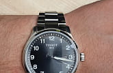 Лаконичный чёрный циферблат с арабскими цифрами привлекательно смотрится на запястье, отлично сочетаясь с серебристыми переливами корпуса и браслета из нержавеющей стали 316L. Часы оснащены кварцевым механизмом ETA F06.115 с высокой точностью хода. Сапфировое стекло устойчиво к образованию царапин. Яркая люминесцентная подсветкаЛюминесцентное покрытиеПозволяет считывать показания времени в темноте. Производители наносят на стрелки, часовые индексы, безель или поверхность циферблата светонакопительный состав, дающий холодное свечение.. Функция EOLEOLПредставляет собой систему, уведомляющую владельца часов о необходимости замены элемента питания. За 2 недели до полного разряда батарейки секундная стрелка перестаёт ходить чётко и начинает перепрыгивать на 3-4 деления., апертура даты. Габариты: 42 x 42 x 8,9 мм.