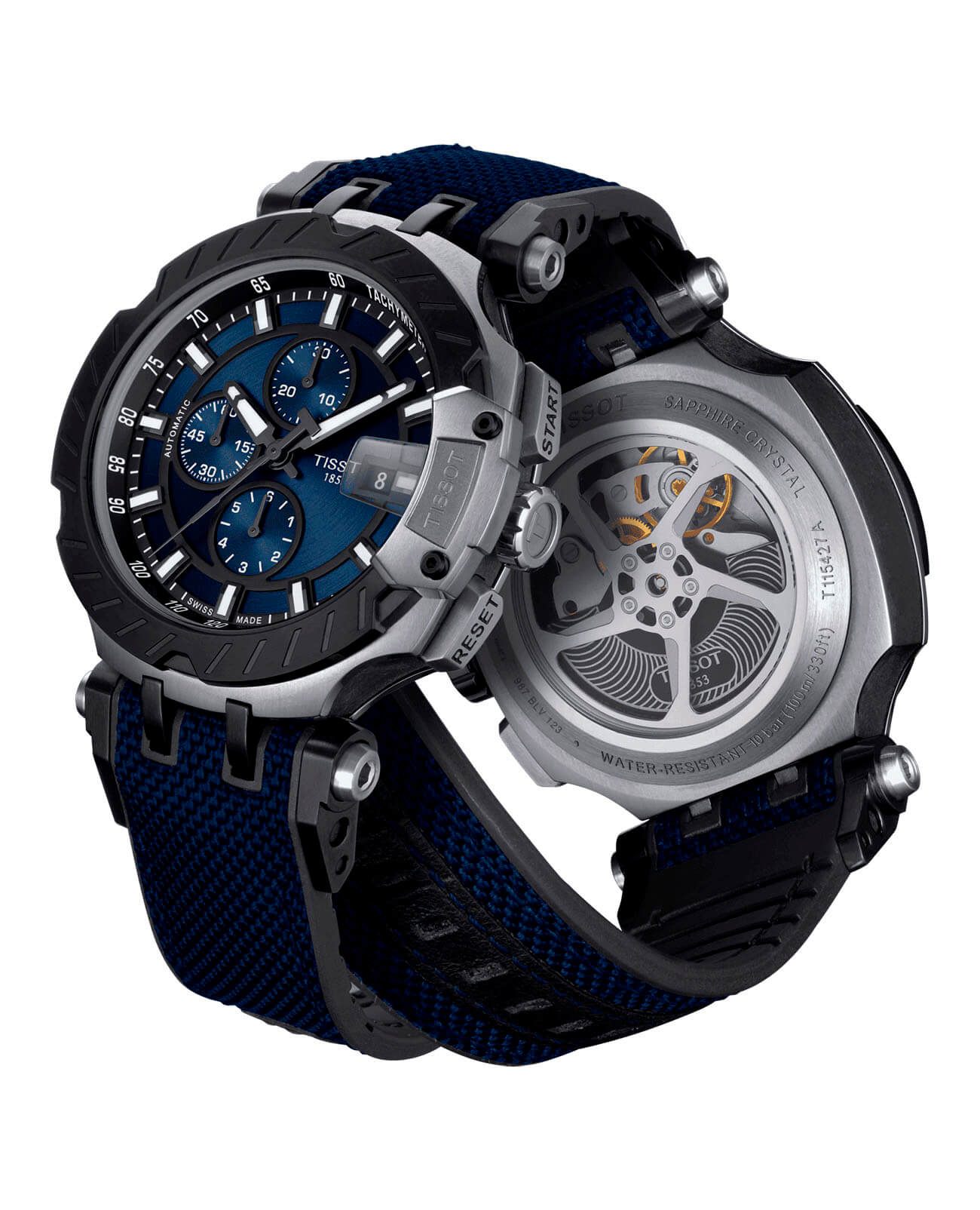 БезельБезельВнешний ободок, закрепляющий стекло. В спортивных часах так называется поворотное кольцо с делениями на циферблате, выполняет роль таймера – замеряет отрезки времени на шкале. Неподвижный безель – элемент декора. Однонаправленно вращающийся безель на дайверских часах позволяет фиксировать моменты погружения и выныривания на поверхность. выполнен в образе тормозного диска, чёрный цвет сочетается с синими переливами массивного циферблата со счётчиками хронографаХронографФункция позволяет измерять отрезки времени с особой точностью: часы, минуты, секунды. Верным признаком хронографа является наличие на циферблате 3 дополнительных окошек-счётчиков.. Задняя крышка сделана в виде колеса. Механические часы с автоподзаводом оснащены швейцарским механизмом C01.211, сохраняющим запас хода до 40 часов. Корпус из долговечной стали 316L с PVD-покрытиемPVDУльтратонкое покрытие наносится в технике вакуумного напыления, сочетает в себе нитрид титана особой прочности со слоем золота или оксида хрома. Несёт в себе декоративную или защитную функцию.. Ремешок из каучука и натуральной кожи. Секундомер, календарь, тахиметрТахиметрРазмеченная шкала, располагается на ободке или безеле часов. Тахиметр позволяет рассчитать скорость на определённом участке пути, расстояние измеряется в километрах или милях.. Габариты: 48,8 x 45 x 16,6 мм.