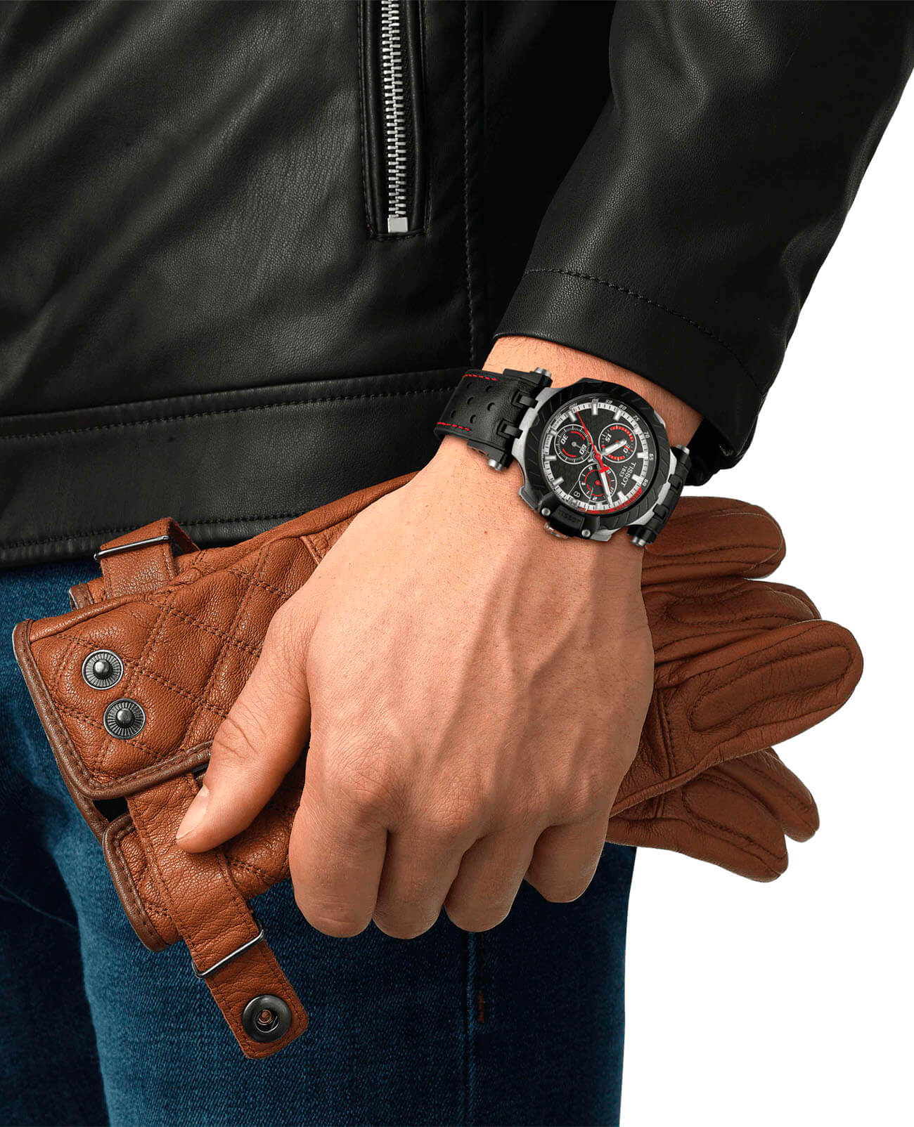 Аксессуар Limited Edition стал отражением скоростной стилистики. Динамичное оформление с мотогоночным дизайном позволит выгодно подчеркнуть повседневный образ. Массивный безельБезельВнешний ободок, закрепляющий стекло. В спортивных часах так называется поворотное кольцо с делениями на циферблате, выполняет роль таймера – замеряет отрезки времени на шкале. Неподвижный безель – элемент декора. Однонаправленно вращающийся безель на дайверских часах позволяет фиксировать моменты погружения и выныривания на поверхность. стилизован под шину мотоцикла, фактурный циферблат с красными акцентами добавляет спортивности. Задняя крышка дополнена узнаваемой гравировкой. Часы – чемпионы не только на трассе, но и в измерении времени. Высокую точность хода обеспечивает швейцарский кварцевый калибр ETA G10.212. Стекло из сапфира с покрытием "антиблик". Перфорированный каучуковый ремешок с кожаной текстурой. Люминесцентная подсветкаЛюминесцентное покрытиеПозволяет считывать показания времени в темноте. Производители наносят на стрелки, часовые индексы, безель или поверхность циферблата светонакопительный состав, дающий холодное свечение.. Корпус из стали 316L с черным PVD-покрытиемPVDУльтратонкое покрытие наносится в технике вакуумного напыления, сочетает в себе нитрид титана особой прочности со слоем золота или оксида хрома. Несёт в себе декоративную или защитную функцию.. Водостойкость 100 метров. Секундомер, тахиметрТахиметрРазмеченная шкала, располагается на ободке или безеле часов. Тахиметр позволяет рассчитать скорость на определённом участке пути, расстояние измеряется в километрах или милях., индикация числа, хронографХронографФункция позволяет измерять отрезки времени с особой точностью: часы, минуты, секунды. Верным признаком хронографа является наличие на циферблате 3 дополнительных окошек-счётчиков.. Габариты: 47,6 x 43 x 12,71 мм.