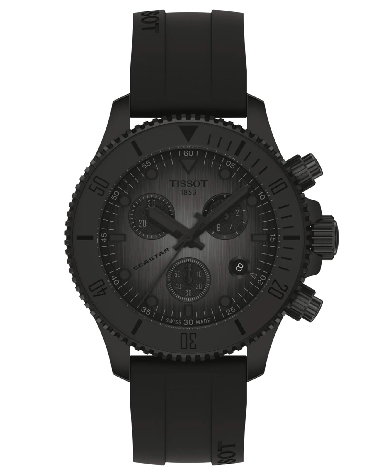 Tissot Seastar 1000 Quartz Chronograph 38mm T120.217.37.061.00 — компактный спортивный хронограф с дайверскими характеристиками. Корпус диаметром 38 мм изготовлен из нержавеющей стали и дополнен чёрным градиентным циферблатом. Безель — поворотный, с чёрным алюминиевым кольцом и 60-минутной шкалой. Циферблат защищён сапфировым стекломСапфировое стеклоПрочный и надёжный материал из кристалла сапфира синтетического происхождения, характеризующийся особой твёрдостью и устойчивостью к царапинам и повреждениям. с антибликовым покрытиемАнтибликовое покрытиеСлой оксида металла в 0,13-0,3 микрон, благодаря которому стекло часов не бликует и не отражает свет. Антибликовое покрытие уменьшает отражение света в 10 раз, обеспечивая отличную читаемость показателей циферблата.. Часовые метки и стрелки с люминесцентным покрытиемЛюминесцентное покрытиеПозволяет считывать показания времени в темноте. Производители наносят на стрелки, часовые индексы, безель или поверхность циферблата светонакопительный состав, дающий холодное свечение. обеспечивают читаемость даже в условиях плохого освещения. На циферблате расположены три счётчика: 1/10 секунды, 60 секунд и 30 минут. Также присутствует окно даты между «4» и «5 часами». Внутри установлен швейцарский кварцевый хронографХронографФункция позволяет измерять отрезки времени с особой точностью: часы, минуты, секунды. Верным признаком хронографа является наличие на циферблате 3 дополнительных окошек-счётчиков., обеспечивающий высокую точность и удобство использования. Модель укомплектована силиконовым белым ремешком с классической застёжкой. Водонепроницаемость до 300 метров делает Seastar 1000 идеальным спутником для плавания и водных видов спорта. Tissot Seastar T120.217.17.011.00 — утончённый дайверский хронограф с профессиональной функциональностью и стильным внешним видом.