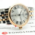 Модель выполнена в минималистичном стиле, нет ни одной лишней детали. Наручные часы предназначены для изящных леди, желающих выглядеть элегантно при любых обстоятельствах. Стильно выглядит тонкий браслет с , где серебристые звенья переплетаются с золотистыми, с нанесённым PVD-покрытиемPVDУльтратонкое покрытие наносится в технике вакуумного напыления, сочетает в себе нитрид титана особой прочности со слоем золота или оксида хрома. Несёт в себе декоративную или защитную функцию.. В основе работы – швейцарский автоматический механизм ETA 2671 с запасом хода до 38 часов. Циферблат с римскими цифрами защищён сапфировым стеклом, устойчивым к царапинам. Корпус и браслет сделаны из стали 316L с антикоррозионными свойствами. На метке 6 часов размещена апертура даты. Габариты: 30 x 30 x 9,5 мм.