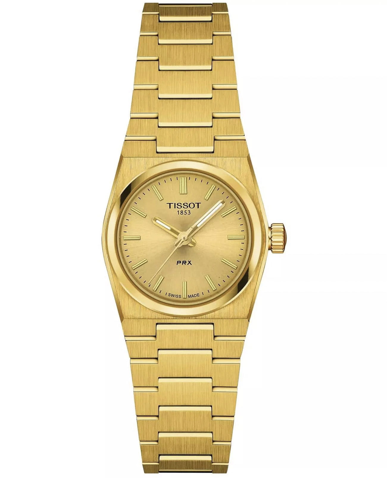 Мужские кварцевые часы Tissot PRX 25 мм T1370103302100 — это стильный аксессуар, вдохновлённый элегантностью 70-х годов. Модель выполнена в тонкой форме из нержавеющей стали 316L с PVD-покрытиемPVDУльтратонкое покрытие наносится в технике вакуумного напыления, сочетает в себе нитрид титана особой прочности со слоем золота или оксида хрома. Несёт в себе декоративную или защитную функцию. цвета жёлтого золота, что придаёт ей благородный внешний вид и устойчивость к царапинам. Циферблат шампанского цвета дополнен индексами, а его поверхность защищена сапфировым стекломСапфировое стеклоПрочный и надёжный материал из кристалла сапфира синтетического происхождения, характеризующийся особой твёрдостью и устойчивостью к царапинам и повреждениям. с антибликовым покрытиемАнтибликовое покрытиеСлой оксида металла в 0,13-0,3 микрон, благодаря которому стекло часов не бликует и не отражает свет. Антибликовое покрытие уменьшает отражение света в 10 раз, обеспечивая отличную читаемость показателей циферблата., устойчивым к повреждениям. Стрелки и метки имеют люминесцентное покрытиеЛюминесцентное покрытиеПозволяет считывать показания времени в темноте. Производители наносят на стрелки, часовые индексы, безель или поверхность циферблата светонакопительный состав, дающий холодное свечение. Super-LumiNova®, обеспечивающее отличную читаемость даже в условиях слабого освещения. Часы оснащены солнечным кварцевым механизмом швейцарского производства, который обеспечивает точную работу и минимальное обслуживание. Аккумулятор Renata 364 гарантирует длительную работу без подзарядки. Браслет из нержавеющей стали с покрытием цвета жёлтого золота оснащён Застёжка "бабочка"Застёжка "бабочка"Такой вид застёжки дополняется предохранителями, помогающими избежать случайного раскрытия браслета. Обладают изящным исполнением. , обеспечивающей комфорт и надёжную фиксацию на запястье. Ремешок является быстросменным, что позволяет легко менять его по желанию. Водонепроницаемость позволяет использовать модель при плавании и других водных активностях без глубокого погружения. Гарантия 2 года подтверждает качество и долговечность изделия. Эти часы станут универсальным аксессуаром для тех, кто ценит сочетание стиля, функциональности и швейцарского мастерства — идеальный выбор для повседневной носки и активного образа жизни.