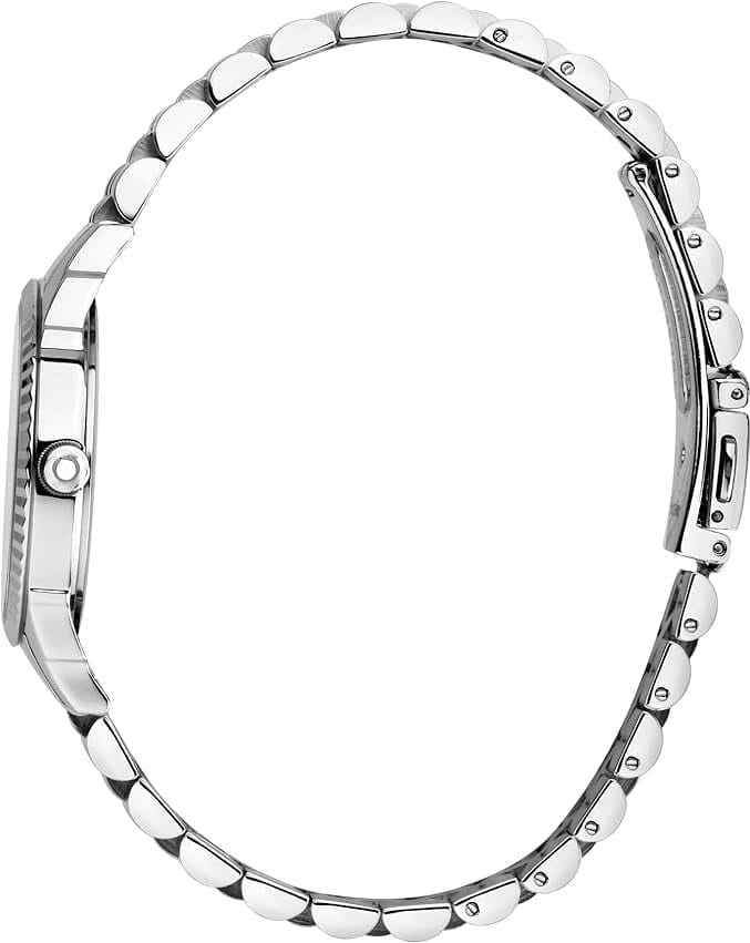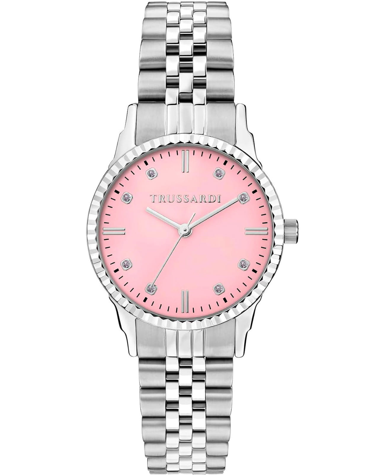 Итальянские женские часы Trussardi T-Bent R2453144510 - это стильный женский аксессуар, который сочетает элегантный дизайн и практичность. Корпус выполнен из нержавеющей стали, что обеспечивает долговечность и утончённый внешний вид. БезельБезельВнешний ободок, закрепляющий стекло. В спортивных часах так называется поворотное кольцо с делениями на циферблате, выполняет роль таймера – замеряет отрезки времени на шкале. Неподвижный безель – элемент декора. Однонаправленно вращающийся безель на дайверских часах позволяет фиксировать моменты погружения и выныривания на поверхность. с алмазной гранью. Надежное минеральное стеклоМинеральное стеклоМинеральное стекло представляет собой искусственно выращенный минерал кварца. Такое стекло отличается особой устойчивостью к повреждениям и царапинам. Уступает по некоторым качествам сапфировому стеклу. защищает циферблат с кристаллами от царапин и обеспечивает долговечность. Модель оснащена кварцевым механизмом, обеспечивающим высокую точность хода. Браслет из нержавеющей стали на раскладной застёжкеРаскладная застёжкаТакой тип застёжки используется только на браслетах из металла. Она никогда не раскрывается полностью, происходит разделение на 2 и более частей. Раскладывающая застёжка снизит вероятность потери часов к минимуму. обеспечивает комфортное ношение. Водозащита 50 метров позволит защитить корпус от случайных брызг или капель дождя. Эта модель – отличный выбор для тех, кто ищет сочетание стиля, качества и функциональности. Часы станут не только полезным аксессуаром, но и выразительным элементом вашего имиджа. В комплекте браслет.