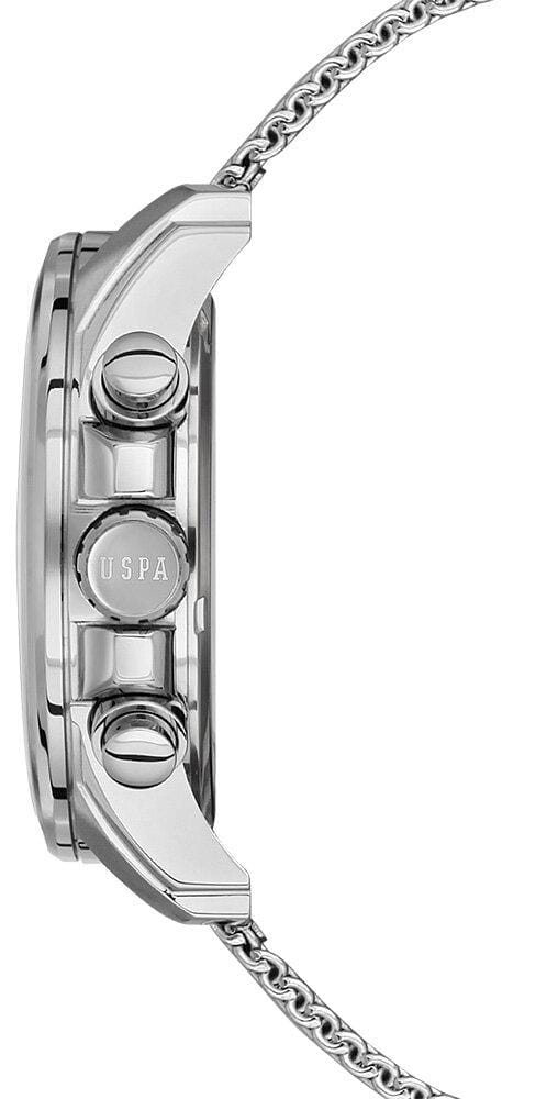 Мужские часы U.S. Polo Assn. Crossing USPA1028-08, кварцевый механизм с высокой точностью. Минеральное стеклоМинеральное стеклоМинеральное стекло представляет собой искусственно выращенный минерал кварца. Такое стекло отличается особой устойчивостью к повреждениям и царапинам. Уступает по некоторым качествам сапфировому стеклу. устойчивое к появлению царапин, обладающее высокой прозрачностью. Корпус изготовлен из нержавеющей стали. На циферблате три дополнительных индикатора. Центральные часовая, минутная и секундная стрелки. Индикация даты и дня недели. 12/24х часовой формат времени. Стрелки с люминесцентным покрытиемЛюминесцентное покрытиеПозволяет считывать показания времени в темноте. Производители наносят на стрелки, часовые индексы, безель или поверхность циферблата светонакопительный состав, дающий холодное свечение.. Класс водозащиты: 50 метров, позволит защитить корпус от случайных брызг или капель дождя. Стальной браслет миланского плетения на раскладном замкеРаскладной замокДанный вариант застежки используется только на часах с металлическим браслетом. Отличительная особенность такого крепления в том, что длина браслета становится универсальной и вы можете самостоятельно отрегулировать нужный вам размер – застежка просто двигается по браслету часов..
