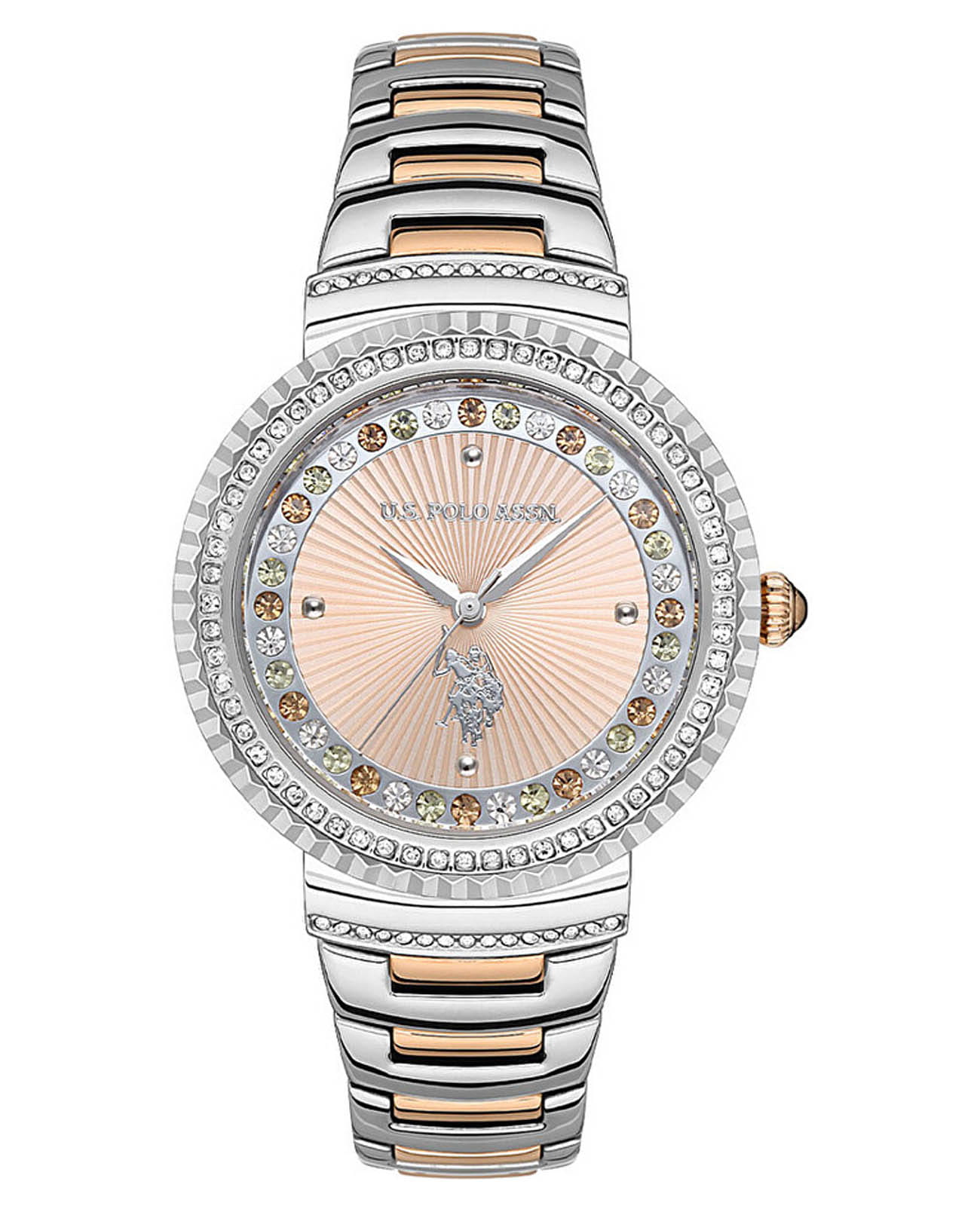 Женские часы U.S. Polo Assn. Stile USPA2056-06, кварцевый механизм с высокой точностью. Минеральное стеклоМинеральное стеклоМинеральное стекло представляет собой искусственно выращенный минерал кварца. Такое стекло отличается особой устойчивостью к повреждениям и царапинам. Уступает по некоторым качествам сапфировому стеклу. устойчивое к появлению царапин, обладающее высокой прозрачностью. Корпус изготовлен из нержавеющей стали. БезельБезельВнешний ободок, закрепляющий стекло. В спортивных часах так называется поворотное кольцо с делениями на циферблате, выполняет роль таймера – замеряет отрезки времени на шкале. Неподвижный безель – элемент декора. Однонаправленно вращающийся безель на дайверских часах позволяет фиксировать моменты погружения и выныривания на поверхность. и циферблат украшены кристаллами. Класс водозащиты: 30 метров, позволит защитить корпус от случайных брызг или капель дождя. Стальной браслет с частичным IP-покрытиемIP-покрытиеМетод ионного напыления. Демонстрирует повышенную устойчивость к истиранию, окислению и химическим веществам. Под воздействием высокого давления и температуры около 1500°C молекулы металла надёжно соединяются с частицами корпуса часов. на застёжке «бабочка» с кнопкамиЗастёжка "бабочка"Такой вид застёжки дополняется предохранителями, помогающими избежать случайного раскрытия браслета. Обладают изящным исполнением. .