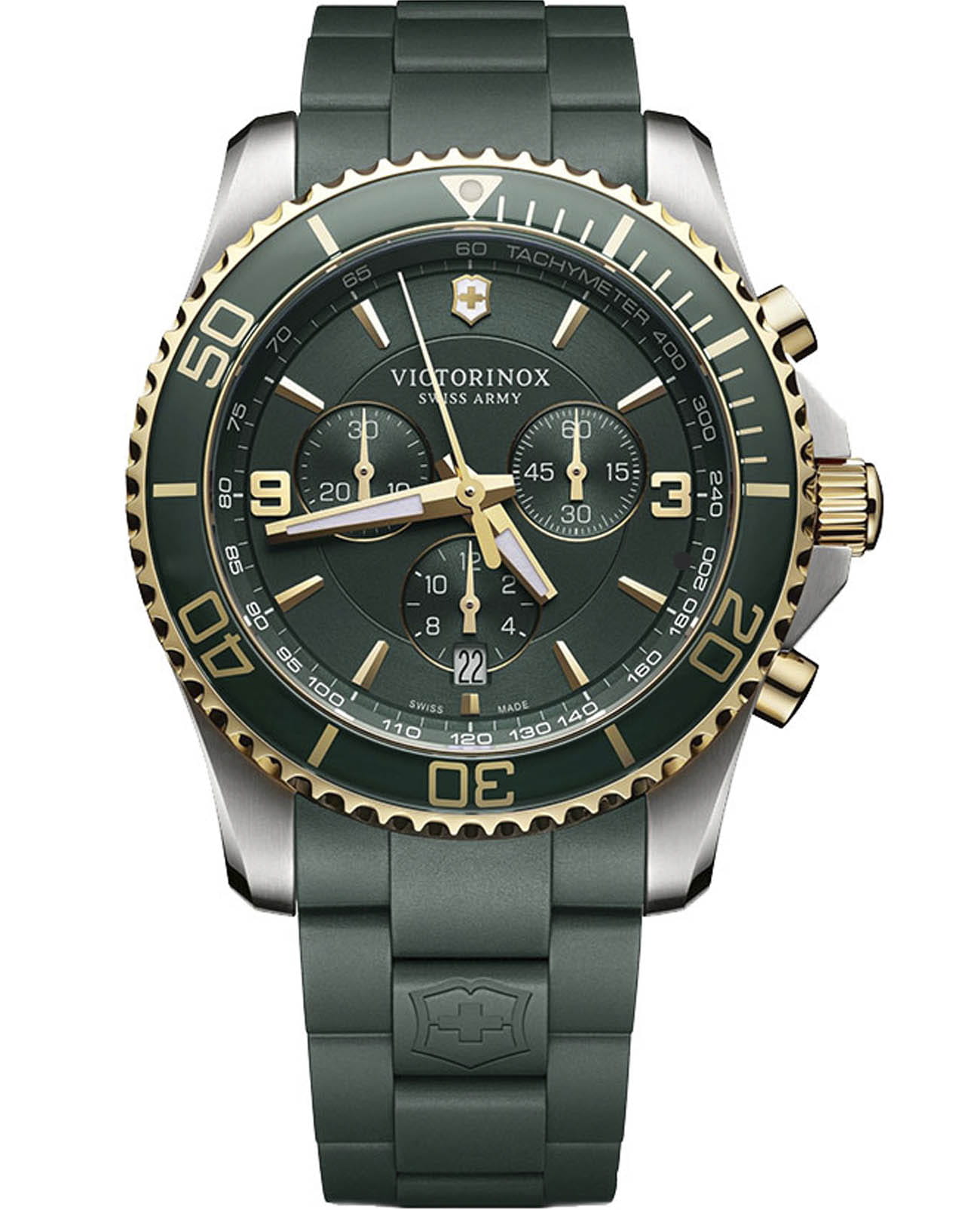 Мужские швейцарские часы Victorinox 241694 из коллекции Maverick Chronograph сочетают спортивную функциональность и элегантный дизайн. Модель представлена круглым корпусом диаметром 43 мм из нержавеющей стали 316L с частичным PVD-покрытиемPVDУльтратонкое покрытие наносится в технике вакуумного напыления, сочетает в себе нитрид титана особой прочности со слоем золота или оксида хрома. Несёт в себе декоративную или защитную функцию. в золотистом оттенке, дополненным насыщенным зеленым циферблатом. Часы оснащены высокоточным швейцарским кварцевым механизмом Ronda 5030.D с функцией хронографа (измерение до 30 минут с точностью 1/10 секунды), тахиметрической шкалой и апертурой даты. Циферблат защищен сапфировым стекломСапфировое стеклоПрочный и надёжный материал из кристалла сапфира синтетического происхождения, характеризующийся особой твёрдостью и устойчивостью к царапинам и повреждениям. с тройным антибликовым покрытием, устойчивым к царапинам, а люминесцентные стрелки Super-Luminova® обеспечивают отличную читаемость в темноте. Водонепроницаемость 10 ATM (100 метров) позволяет использовать часы для плавания и снорклинга. Однонаправленный вращающийся безель в дайверском стиле дополняет функционал модели. Резиновый ремешок зеленого цвета шириной 22 мм с классической пряжкой обеспечивает комфортную посадку на запястье.