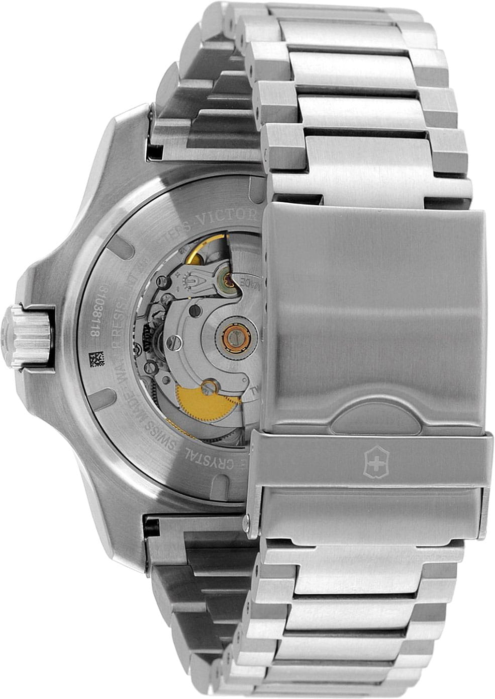 Мужские швейцарские часы Victorinox I.N.O.X. MECHANICAL 241837. Сапфировое стеклоСапфировое стеклоПрочный и надёжный материал из кристалла сапфира синтетического происхождения, характеризующийся особой твёрдостью и устойчивостью к царапинам и повреждениям. с трёхслойным антибликовым покрытием. Корпус часов выполнен из нержавеющей стали 316L. Стальной браслет на раскладной застёжкеРаскладная застёжкаТакой тип застёжки используется только на браслетах из металла. Она никогда не раскрывается полностью, происходит разделение на 2 и более частей. Раскладывающая застёжка снизит вероятность потери часов к минимуму.. Влагозащита: 200 метров, позволит плавать, нырять и заниматься другими водными видами спорта. Окошко даты находится в положении между 4 и 5 часов. Стрелки и метки с люминесцентным покрытиемЛюминесцентное покрытиеПозволяет считывать показания времени в темноте. Производители наносят на стрелки, часовые индексы, безель или поверхность циферблата светонакопительный состав, дающий холодное свечение..