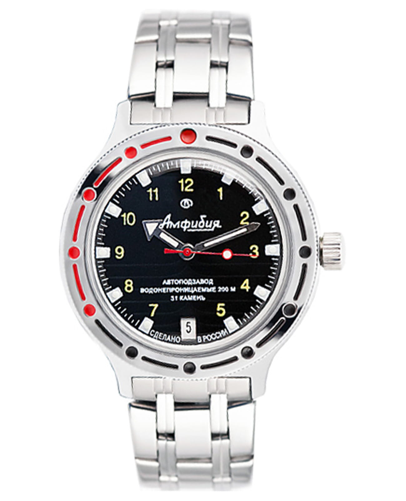 Эти практичные часы великолепно сидят на руке и позволят вам чувствовать себя уверенно в любой обстановке. Амфибия Классика. В механизме 31 камень, частота 19800 полуколебаний в час. Запас хода 31 час. Противоударное устройство оси баланса. Браслет с раскладывающейся застежкой.