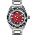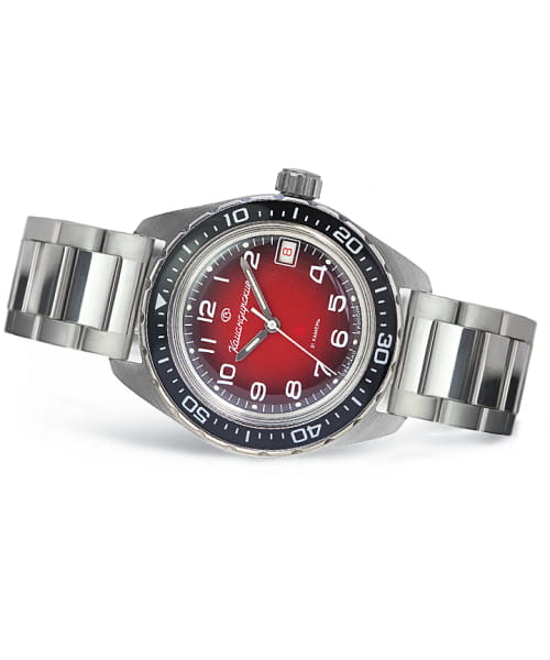 Мужские российские механические наручные часы Восток Командирские 02035А, механический механизм (автоматический калибр) с высокой точностью. Класс водозащиты: 200 метров, позволит плавать, нырять и заниматься другими водными видами спорта. Стрелки с люминесцентным покрытиемЛюминесцентное покрытиеПозволяет считывать показания времени в темноте. Производители наносят на стрелки, часовые индексы, безель или поверхность циферблата светонакопительный состав, дающий холодное свечение.. Вращающийся безельБезельВнешний ободок, закрепляющий стекло. В спортивных часах так называется поворотное кольцо с делениями на циферблате, выполняет роль таймера – замеряет отрезки времени на шкале. Неподвижный безель – элемент декора. Однонаправленно вращающийся безель на дайверских часах позволяет фиксировать моменты погружения и выныривания на поверхность. из нержавеющей стали с PVDPVDУльтратонкое покрытие наносится в технике вакуумного напыления, сочетает в себе нитрид титана особой прочности со слоем золота или оксида хрома. Несёт в себе декоративную или защитную функцию. покрытием. Окошко даты находится в положении 3 часа. Автоподзавод с предохранительным устройством от перезаводки пружины. Частота: 19800 полуколебаний/час. Браслет с раскладной застёжкойРаскладная застёжкаТакой тип застёжки используется только на браслетах из металла. Она никогда не раскрывается полностью, происходит разделение на 2 и более частей. Раскладывающая застёжка снизит вероятность потери часов к минимуму..