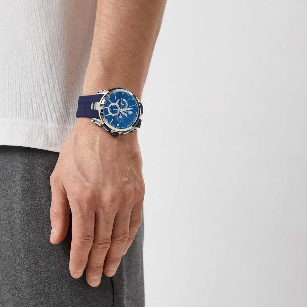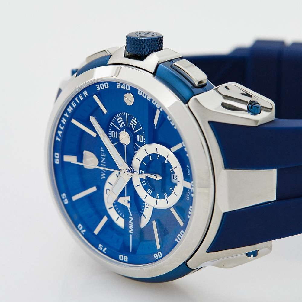Мужские кварцевые часы-хронографХронографФункция позволяет измерять отрезки времени с особой точностью: часы, минуты, секунды. Верным признаком хронографа является наличие на циферблате 3 дополнительных окошек-счётчиков. с секундомеромСекундомерСекундоме́р — прибор, способный измерять интервалы времени с точностью до долей секунды. Wainer WA.16910-I сочетает элегантный дизайн и высокое качество исполнения. Корпус выполнен из нержавеющей стали с частичным PVD-покрытиемPVDУльтратонкое покрытие наносится в технике вакуумного напыления, сочетает в себе нитрид титана особой прочности со слоем золота или оксида хрома. Несёт в себе декоративную или защитную функцию., диаметром 47 мм и толщиной 12 мм, обеспечивает прочность и долговечность. Циферблат с метками в виде штрихов выполнен по технологии Sunray (солнечные лучи) и украшен фирменным логотипом Wainer и дополнен тахиметромТахиметрРазмеченная шкала, располагается на ободке или безеле часов. Тахиметр позволяет рассчитать скорость на определённом участке пути, расстояние измеряется в километрах или милях.. Сапфировое стеклоСапфировое стеклоПрочный и надёжный материал из кристалла сапфира синтетического происхождения, характеризующийся особой твёрдостью и устойчивостью к царапинам и повреждениям. защищает дисплей от царапин и механических повреждений. Окошко даты находится в положении 6 часов. Стрелки с люминесцентным покрытиемЛюминесцентное покрытиеПозволяет считывать показания времени в темноте. Производители наносят на стрелки, часовые индексы, безель или поверхность циферблата светонакопительный состав, дающий холодное свечение., улучшая читаемость в условиях недостаточного освещения. Силиконовый ремешок на стандартной застёжке обеспечивает комфортное ношение. Водонепроницаемость до 100 метров делает модель подходящей для плавания и активного образа жизни. Wainer — это стильный и надежный аксессуар для тех, кто ценит швейцарское качество и современные технологии.