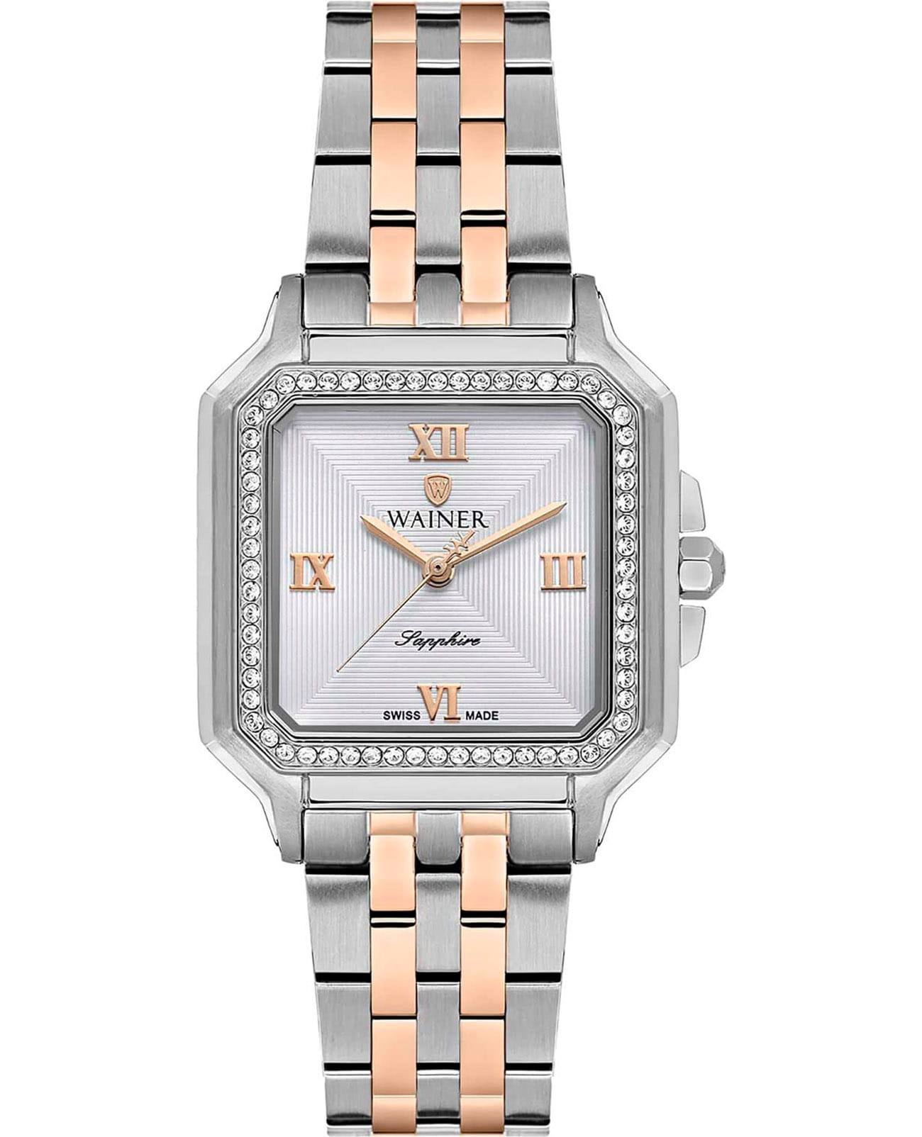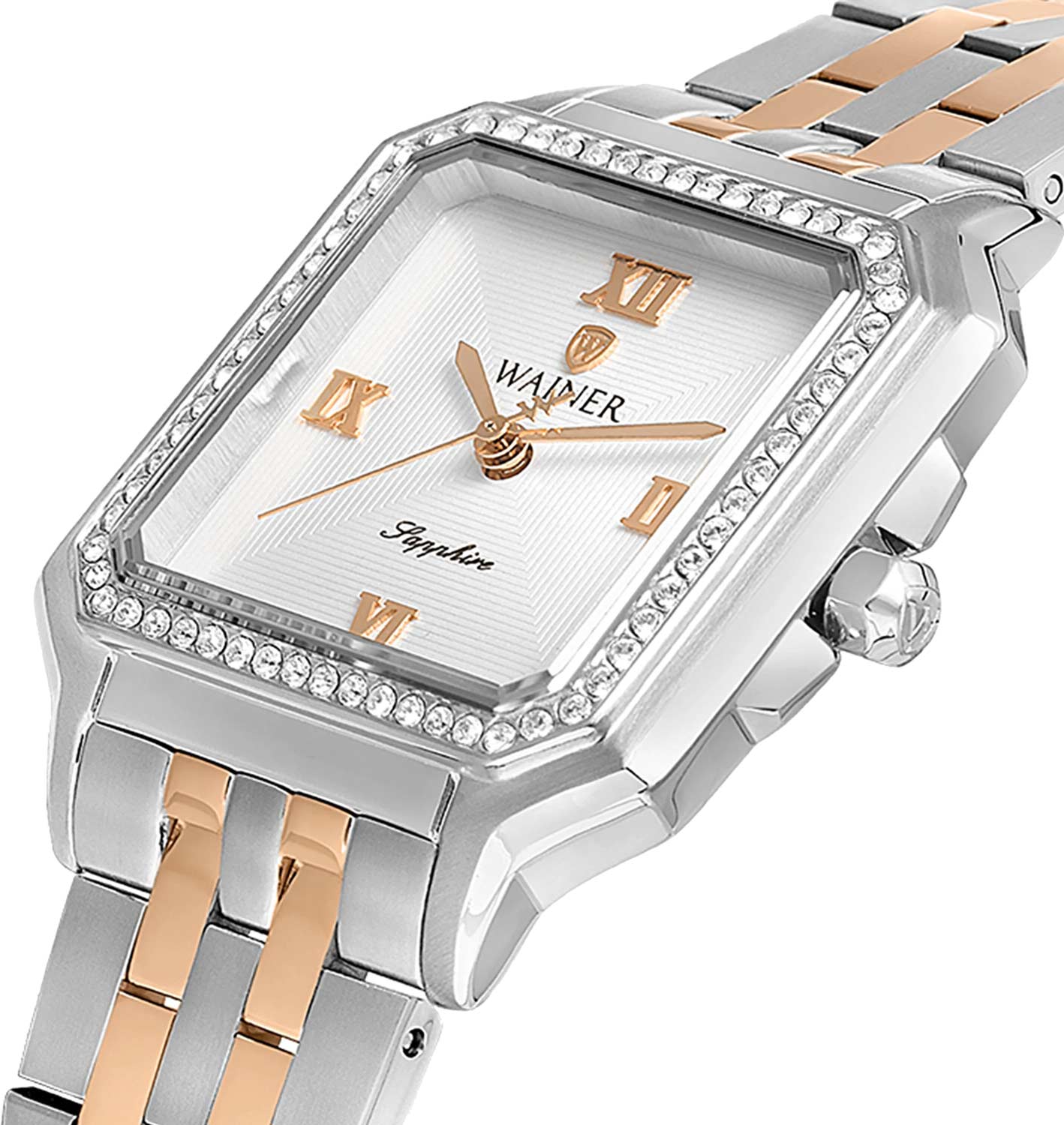 Женские кварцевые часы Wainer WA.18080-C — это изысканный аксессуар, воплощающий швейцарское качество и элегантность. Модель выполнена в квадратной форме из стали 316L, а её корпус украшен люминесцентным покрытиемЛюминесцентное покрытиеПозволяет считывать показания времени в темноте. Производители наносят на стрелки, часовые индексы, безель или поверхность циферблата светонакопительный состав, дающий холодное свечение. и инкрустирован кристаллами, что придаёт ему роскошный внешний вид. Циферблат серебристого цвета гильоширован и дополнен римскими цифрами, а секундная стрелка на конце декорирована буквой W, подчёркивая внимание к деталям. Защиту механизма обеспечивает сапфировое стеклоСапфировое стеклоПрочный и надёжный материал из кристалла сапфира синтетического происхождения, характеризующийся особой твёрдостью и устойчивостью к царапинам и повреждениям., устойчивое к повреждениям. Гранёная заводная головка с защитой оснащена фирменным логотипом, добавляя модели индивидуальности. Браслет из стали 316L с частичным PVD-покрытиемPVDУльтратонкое покрытие наносится в технике вакуумного напыления, сочетает в себе нитрид титана особой прочности со слоем золота или оксида хрома. Несёт в себе декоративную или защитную функцию. розового цвета шириной 16 мм оснащён Раскладная застёжкаРаскладная застёжкаТакой тип застёжки используется только на браслетах из металла. Она никогда не раскрывается полностью, происходит разделение на 2 и более частей. Раскладывающая застёжка снизит вероятность потери часов к минимуму., обеспечивающей комфорт и надёжную фиксацию на запястье. Водонепроницаемость позволяет использовать модель при мытье рук или под лёгким дождём. Механизм калибра Ronda 763 гарантирует точность хода и надёжность. Эти часы станут универсальным аксессуаром для тех, кто ценит сочетание стиля, функциональности и швейцарского мастерства — идеальный выбор для повседневной носки и торжественных случаев.
