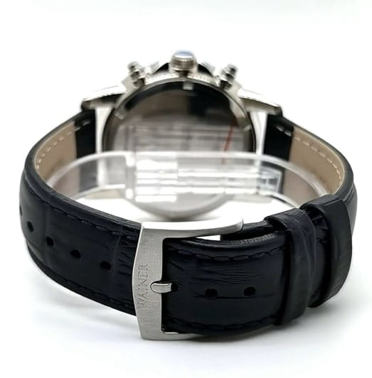 Модель Wainer WA.19595-E сочетает швейцарскую точность, стильный дизайн и функциональность. Корпус диаметром 44 мм выполнен из нержавеющей стали 316L, обеспечивающей прочность и долговечность. Циферблат оформлен в динамичном стиле, дополнен хронографомХронографФункция позволяет измерять отрезки времени с особой точностью: часы, минуты, секунды. Верным признаком хронографа является наличие на циферблате 3 дополнительных окошек-счётчиков. для точного измерения времени, а сапфировое стеклоСапфировое стеклоПрочный и надёжный материал из кристалла сапфира синтетического происхождения, характеризующийся особой твёрдостью и устойчивостью к царапинам и повреждениям. защищает дисплей от царапин и механических повреждений. Часы оснащены кварцевым механизмом, обеспечивающим стабильную точность. Синий кожаный ремешок гарантирует комфортное ношение и долговечность. Водонепроницаемость до 50 метров защищает часы от случайных брызг и дождя. Wainer WA.19595-E — это стильный аксессуар для мужчин, ценящих швейцарское качество, современные технологии и классическую элегантность.