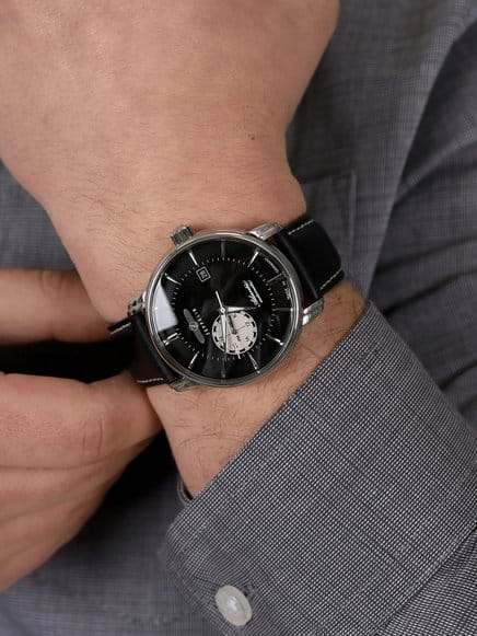 Часы Zeppelin 8470-2 — это квинтэссенция элегантности и точности.  Эти часы оснащены автоматическим механизмом с серебристым стальным корпусом круглой формы и черным ремешком с пряжкой из натуральной кожи. Черный циферблат дополнен датой дня месяца и дополнительным циферблатом с указанием времени в 24-часовом формате. Люминесцентное покрытиеЛюминесцентное покрытиеПозволяет считывать показания времени в темноте. Производители наносят на стрелки, часовые индексы, безель или поверхность циферблата светонакопительный состав, дающий холодное свечение. на стрелках обеспечивает разборчивость в темноте, а закаленное минеральное стеклоМинеральное стеклоМинеральное стекло представляет собой искусственно выращенный минерал кварца. Такое стекло отличается особой устойчивостью к повреждениям и царапинам. Уступает по некоторым качествам сапфировому стеклу. защищает от царапин, что делает его идеальным выбором для любого джентльмена. Водонепроницаемость этой модели составляет 50 метров. Эти часы подойдут для повседневного ношения и станут ярким акцентом в вашем наряде.